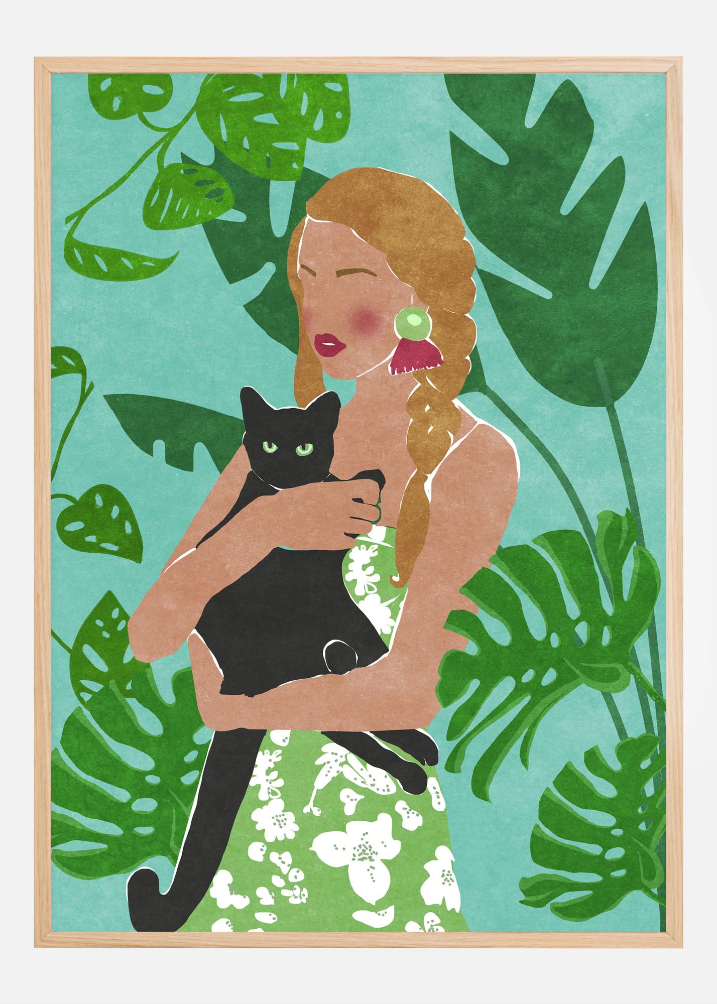 In the poster, calm and earthy tones dominate. The green shades from the plants and background offer a peaceful contrast to the woman's beige and brown tones, and the cat's deep black color. The details in the white dress with floral motifs add lightness to the composition. The poster is surrounded by a wooden frame (not included in the motif) that further enhances the natural feeling. This is a print that is not only a beautiful interior detail but also an expression of animal friendliness and a tribute to life's simple joys.