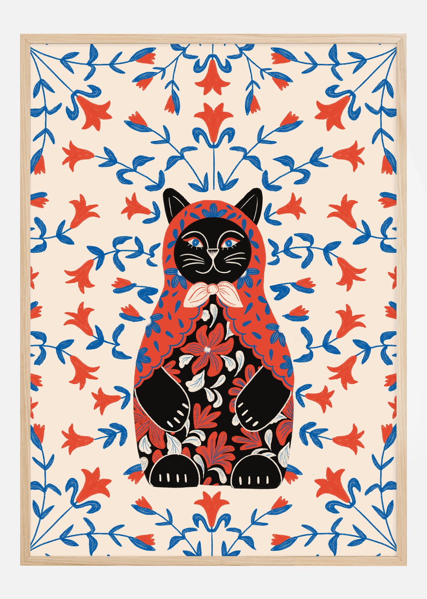 This colorful and vibrant poster is a modern interpretation of the classic Russian matryoshka, reimagined as a majestic cat figure sitting in the center surrounded by a lush flower garden. The cat's gaze is penetrating and mysterious, while its fur is richly adorned with intricate floral patterns. Around the cat, a sea of red and blue flowers spreads out against a cream-colored background, creating an almost hypnotic pattern that is both captivating and beautiful.
