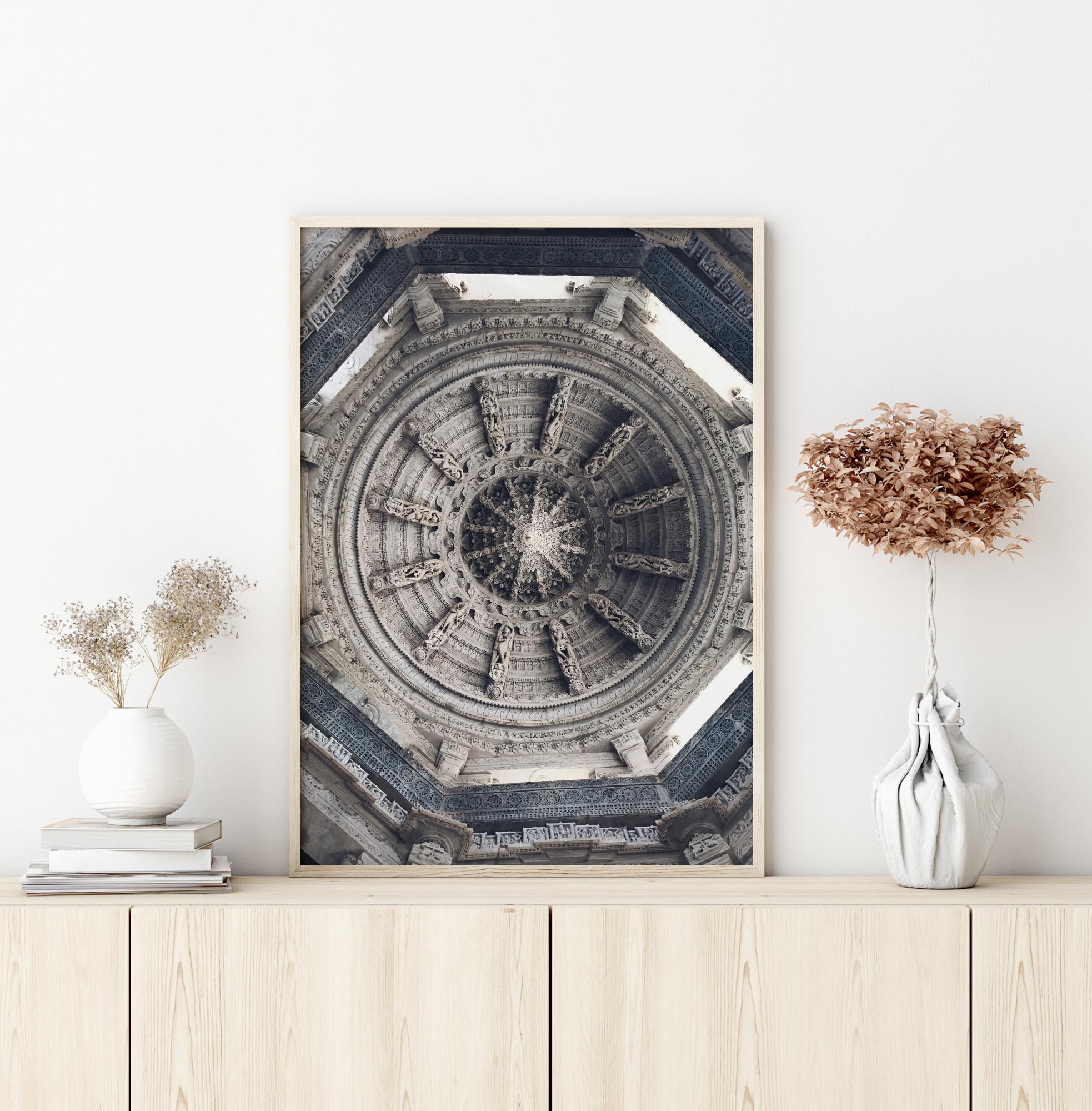 A black and white poster of a stone grey ceiling. The ceiling is designed using circles and looks like a ship's wheel. Surrounded by an octagon, this has geometric shapes everywhere. Breathe life into a soft blue wall by adding this ceiling poster.