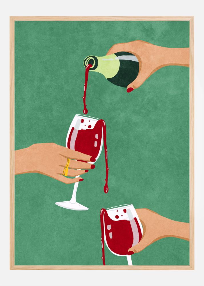 This playful and sophisticated poster captures the essence of friendship and celebration. The illustration shows three hands elegantly holding wine glasses and a bottle, with a stream of red wine being poured into one of the glasses. This scene is a tribute to the small moments that make life special, and is an ideal choice for those who want to add a sense of togetherness and festivity to their home. The print is as much a conversation starter as it is a decorative interior detail.