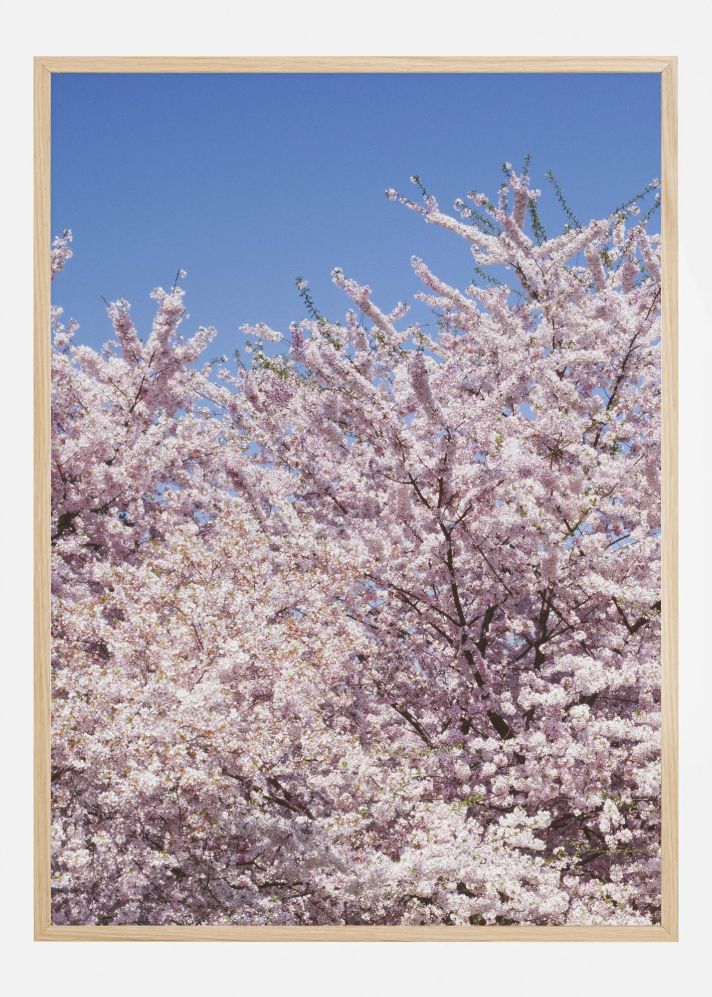 A natural poster of a stunning array of white cherry tree blossoms against a bright blue sky. White blooms fill this image and stand in strong contrast to the sky. Bring this home and fill up your house with a natural feeling when you see this on your wall.