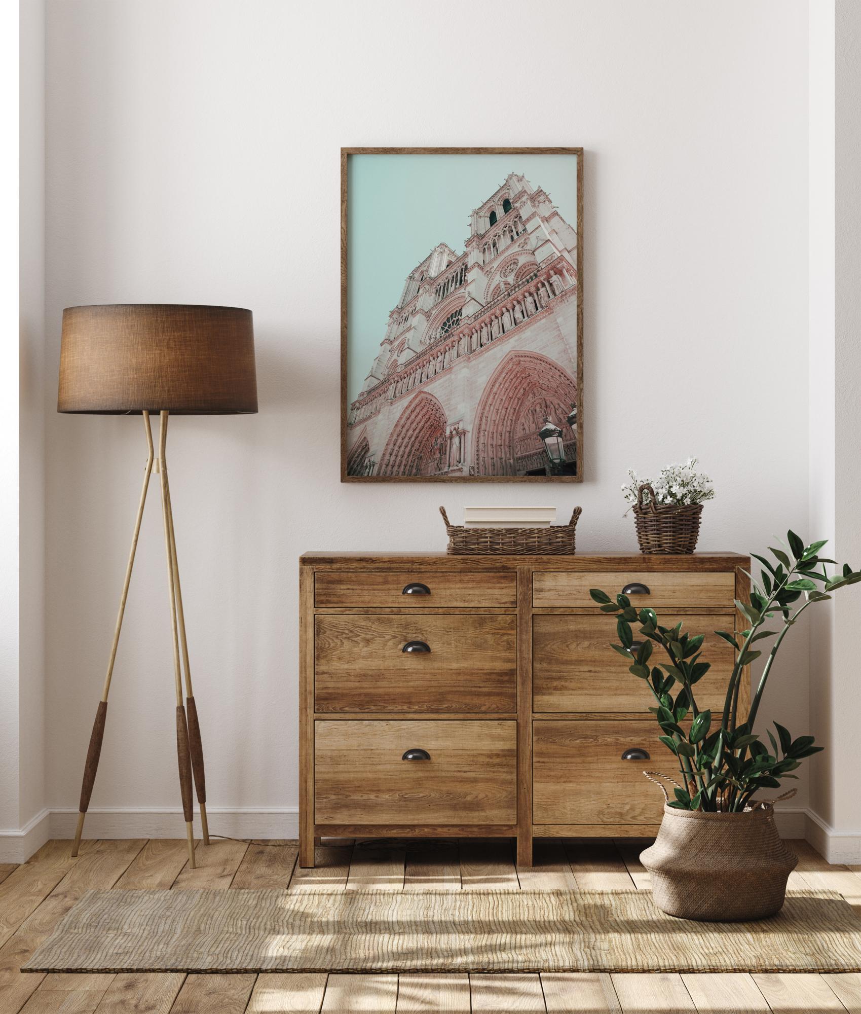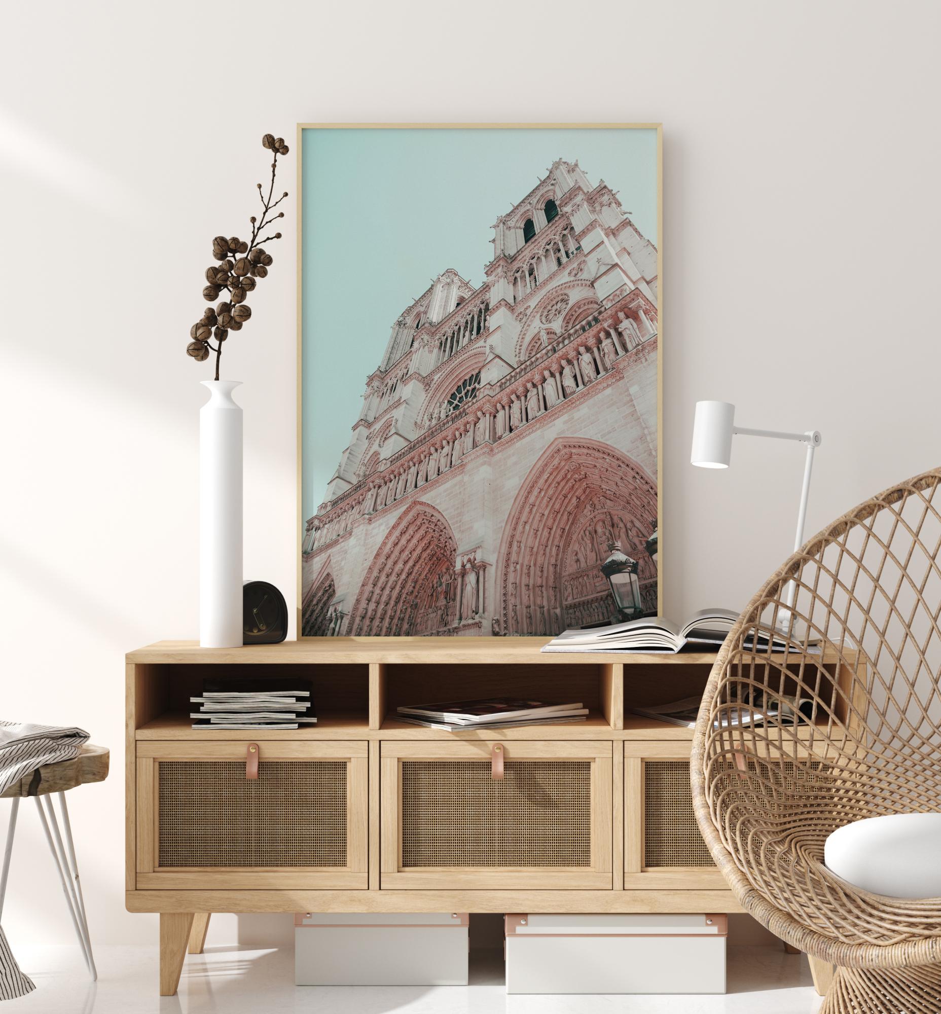 A dramatic poster of the facade of a church. Look up this white and pink building with its Gothic arches, stone saint statues and round windows. The soft pastels create a harmonious feel, the perfect way to create a soothing vibe at home.