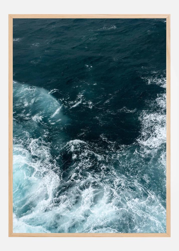 An ocean poster with the waves crashing and swirling in the open sea. White foam swirls at the base of this image and then the waters calm down to a dark aquamarine. Imagine you're on a boat on the waves with this stunning piece.