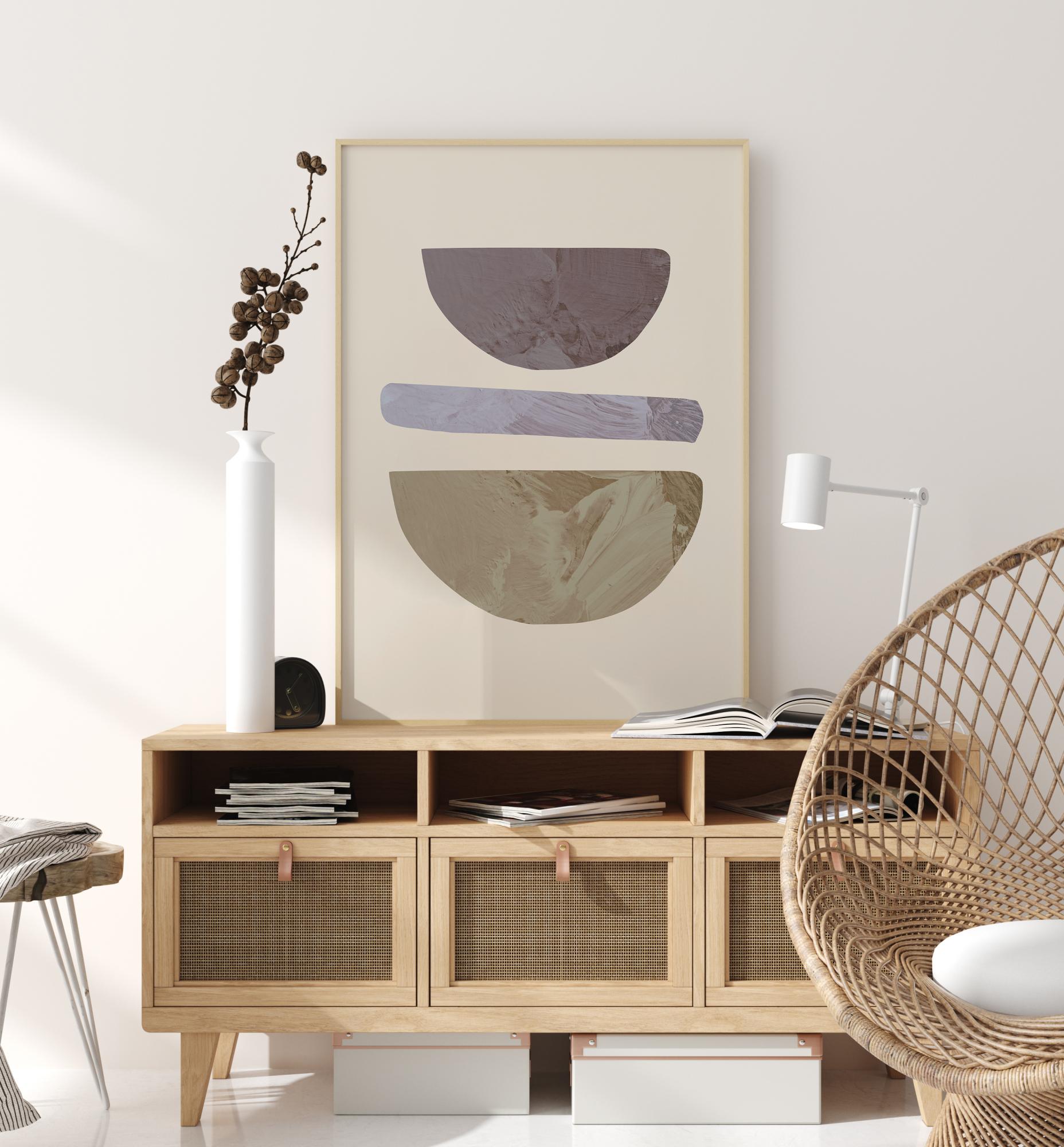 An abstract poster featuring three distinct shapes in different paint strokes. A large cream and beige semicircle sits at the bottom with a thin blue bar above it. At the top is a second semicircle in grey and blue. Create a talking point when you hang this in your hall at home.