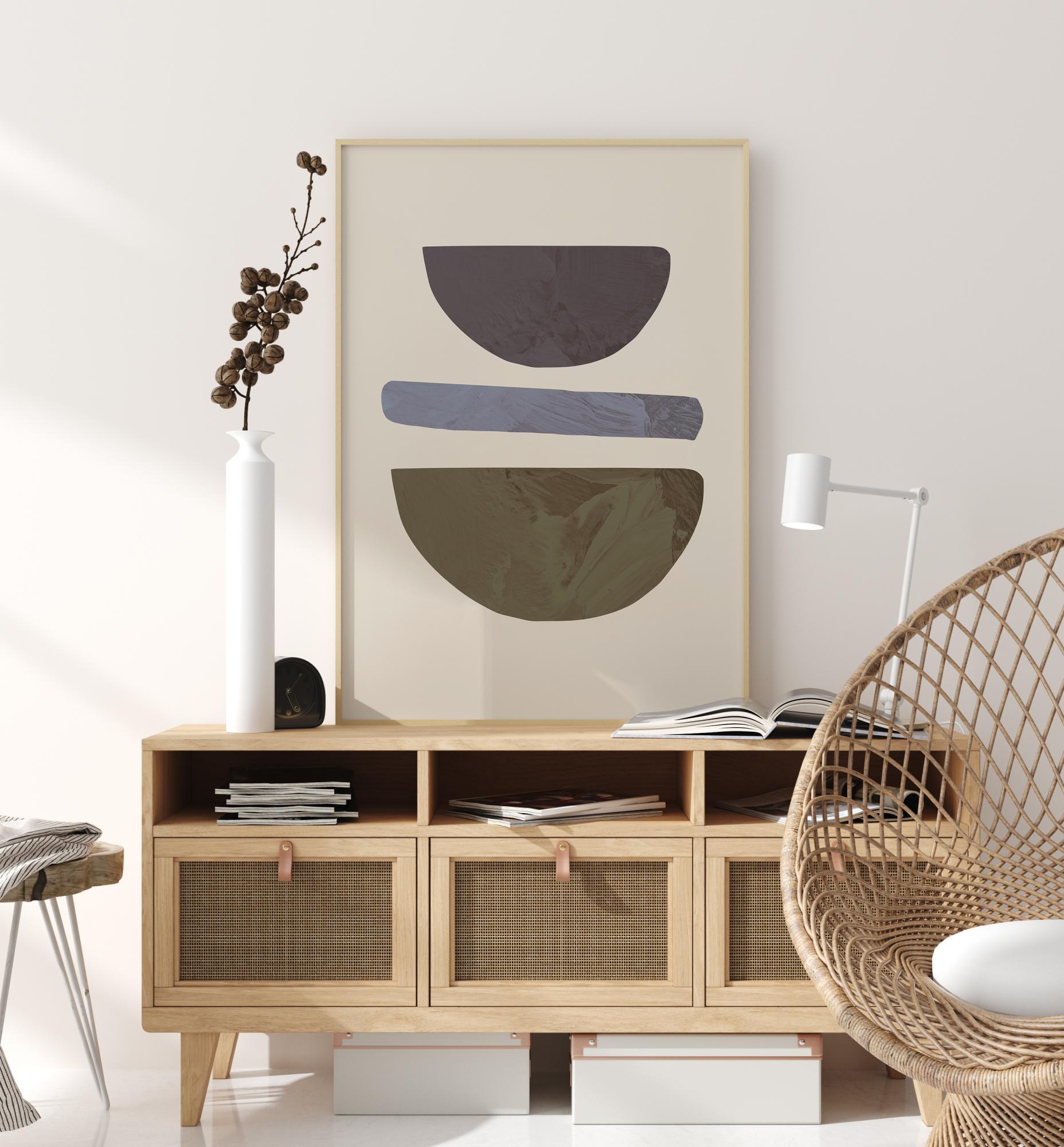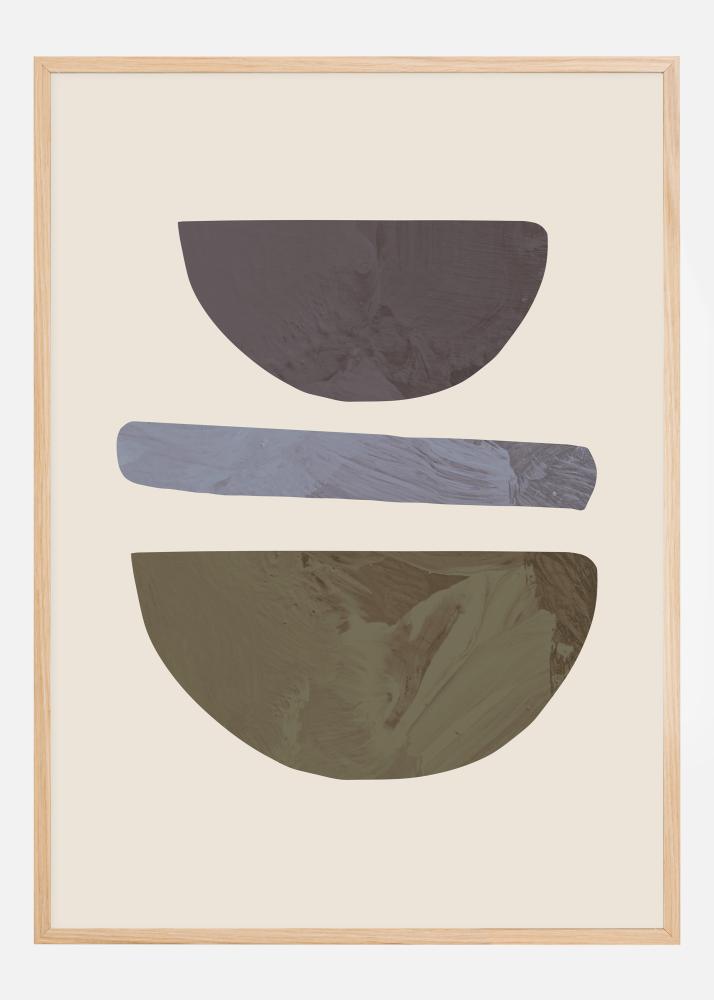 An abstract poster with three different shapes and colours. A brown semicircle sits at the base with a light blue bar in the centre of the image. Above, is a dark grey half circle, all on a white background. Add this to a plain wall for a great talking point.