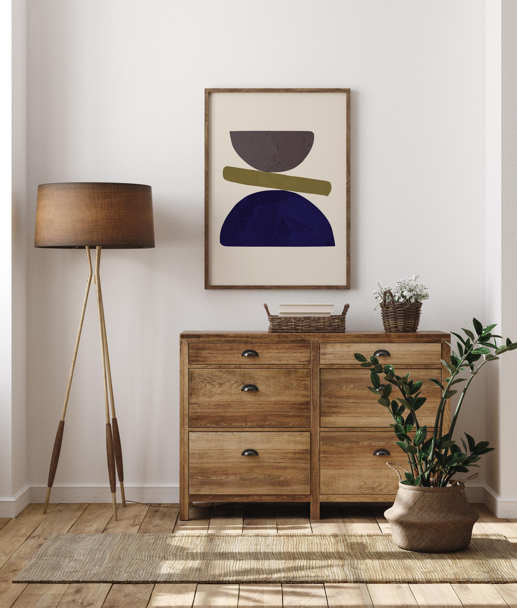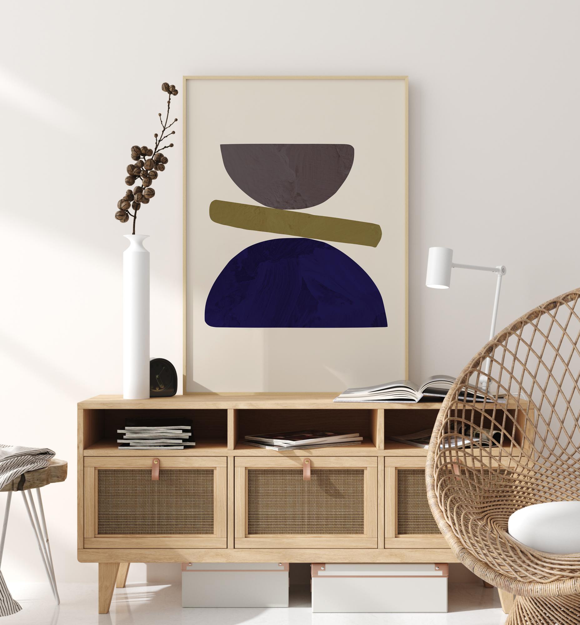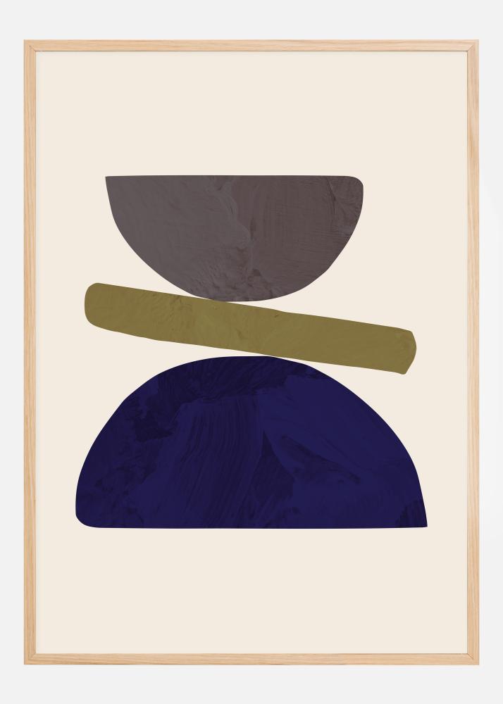 A poster about balance through geometry. A large blue semicircle balances a thin green oblong shape on its curve. On top of that, a grey half circle balances to create an hourglass shape. Spend hours looking at this piece to find the other shapes within it.