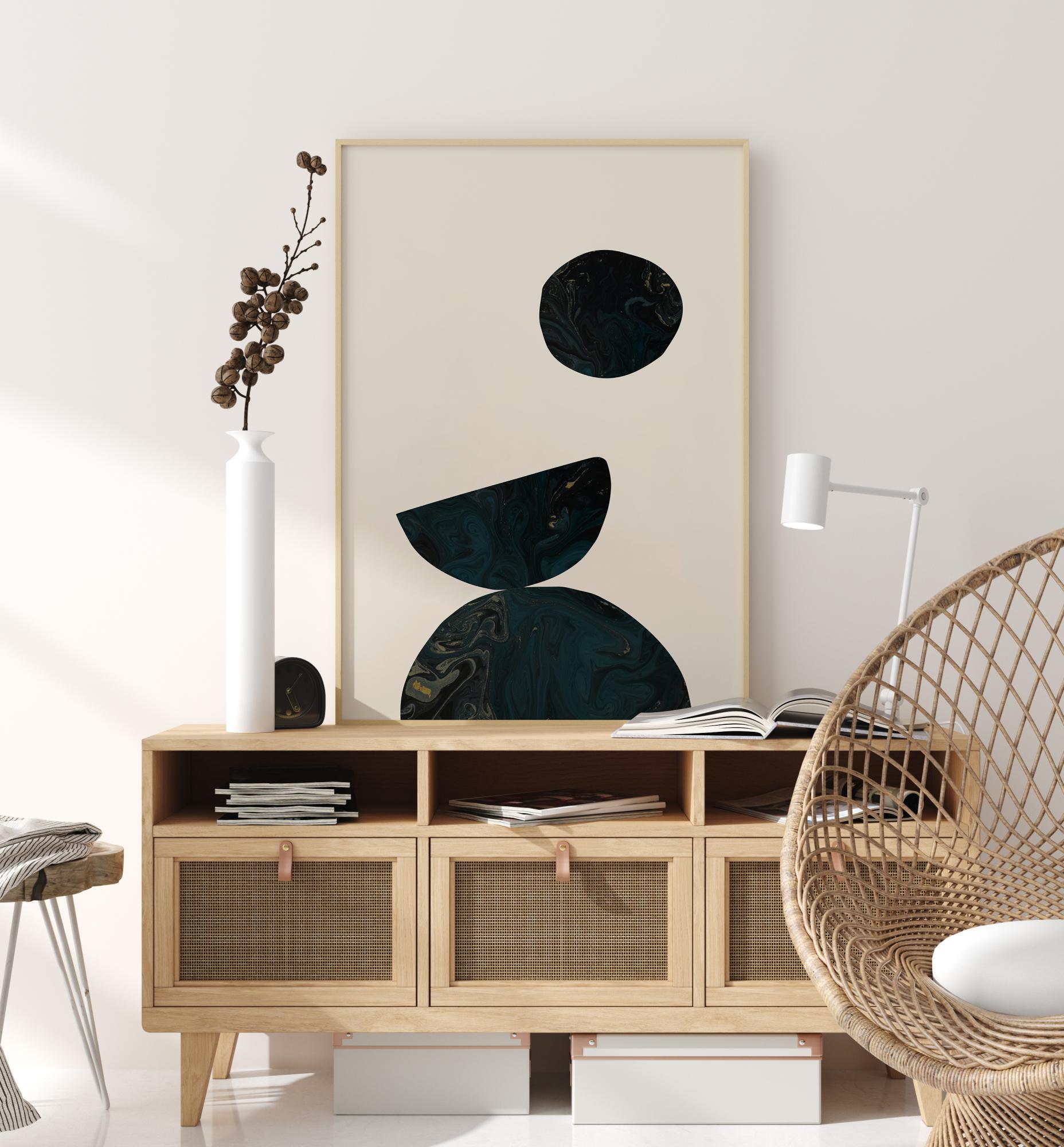 A bright poster with three dark blue and black shapes creating a compelling image. A half circle sits at the bottom balancing another up-turned semicircle. Floating above is a black circle all on a striking white background. Match the beautiful marble swirls with a paler tone on the walls for added drama.