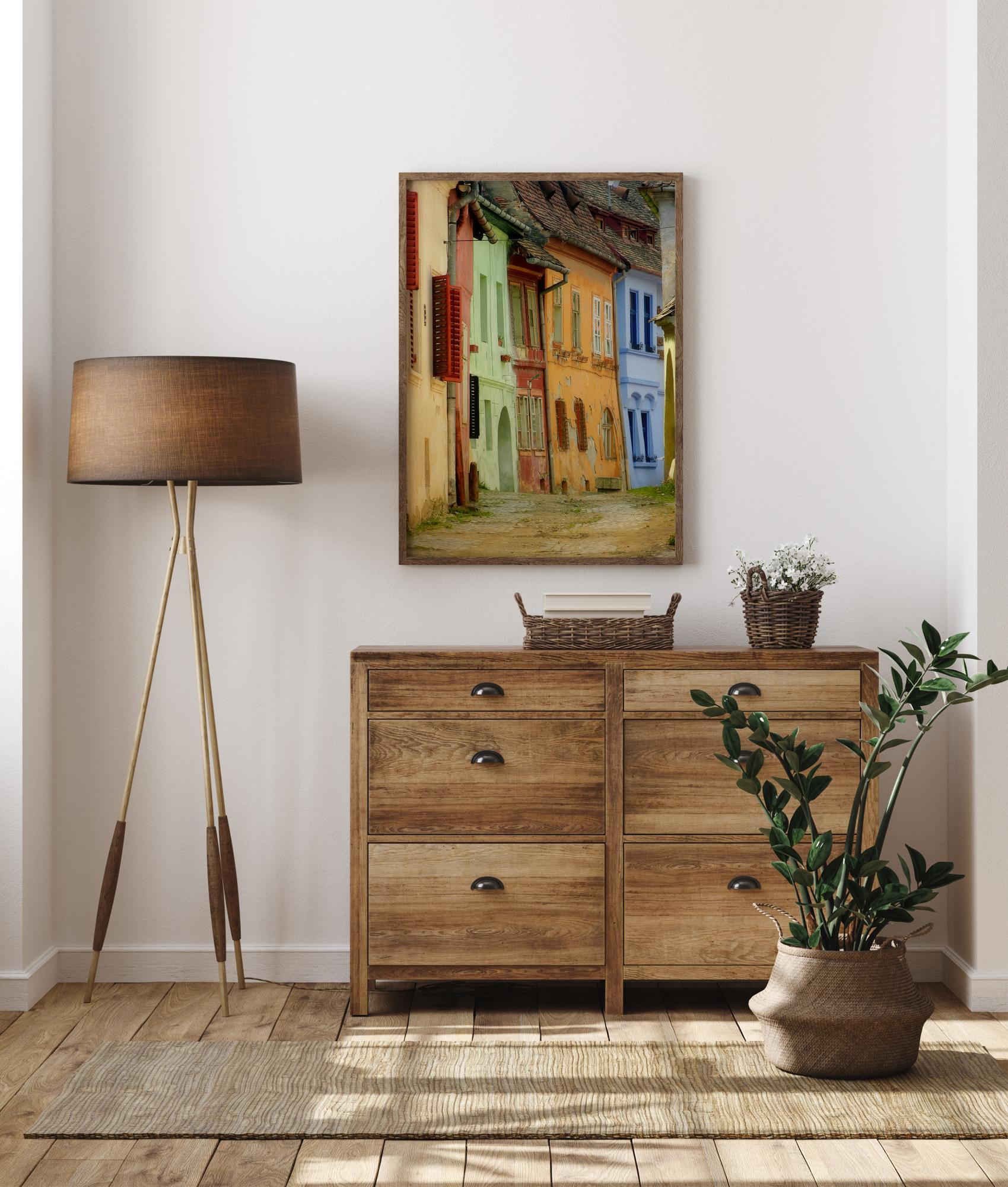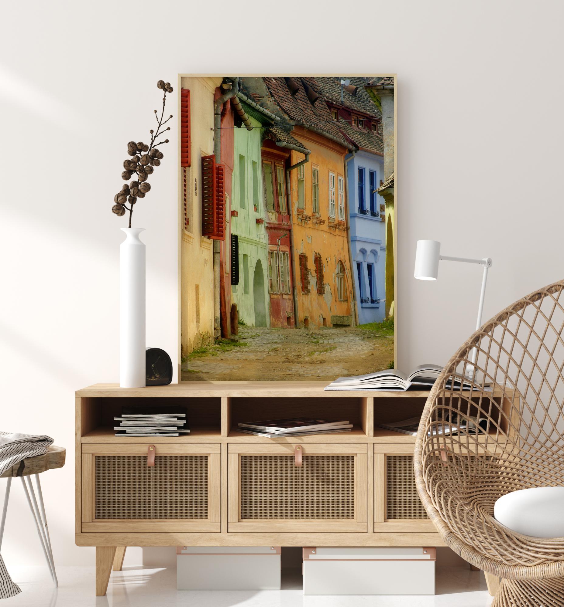 A quaint poster of old, but colourful houses along a narrow street. The cobbled street leads between beige, green, orange and blue houses with tiled rooves and wide open red shutters. Enjoy the quaint, calm ambience imbued in this charming pictoresque scene.
