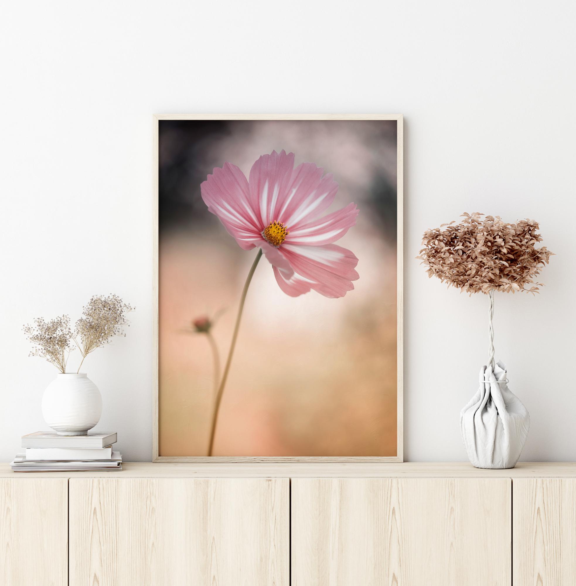 A stunning poster of a Cosmos cupcake flower with the light shining through the petals. The pink of the petals and the yellow centre are bright with a soft peach background for depth. Feel bright and breezy when you look at this soft pastel image in your home.