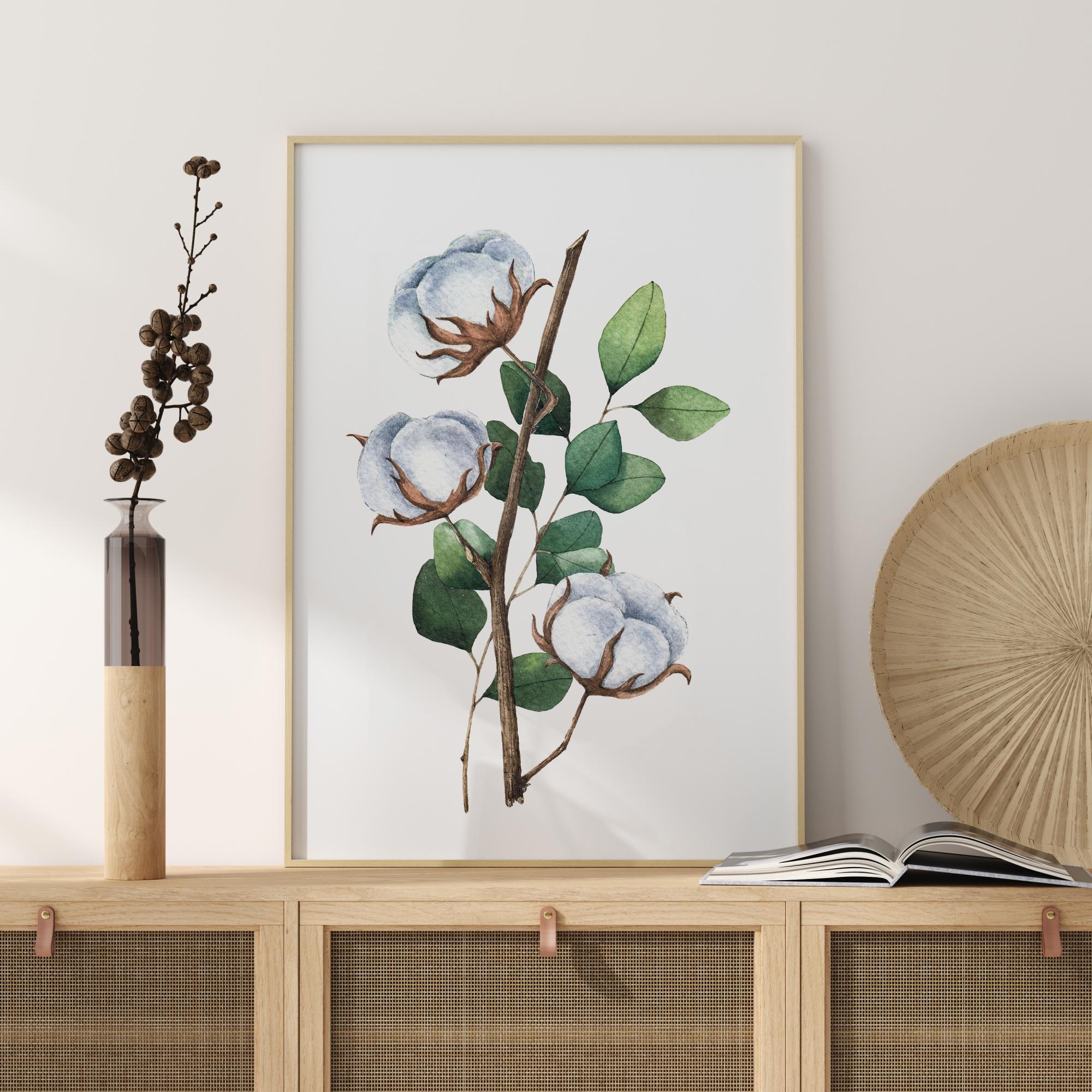 An illustrative poster of a single cotton flower. This artistic botanical illustration style piece carefully highlights the large cotton blooms against a pure white background. Take this home for the perfect budding botanist as a great statement for any home.