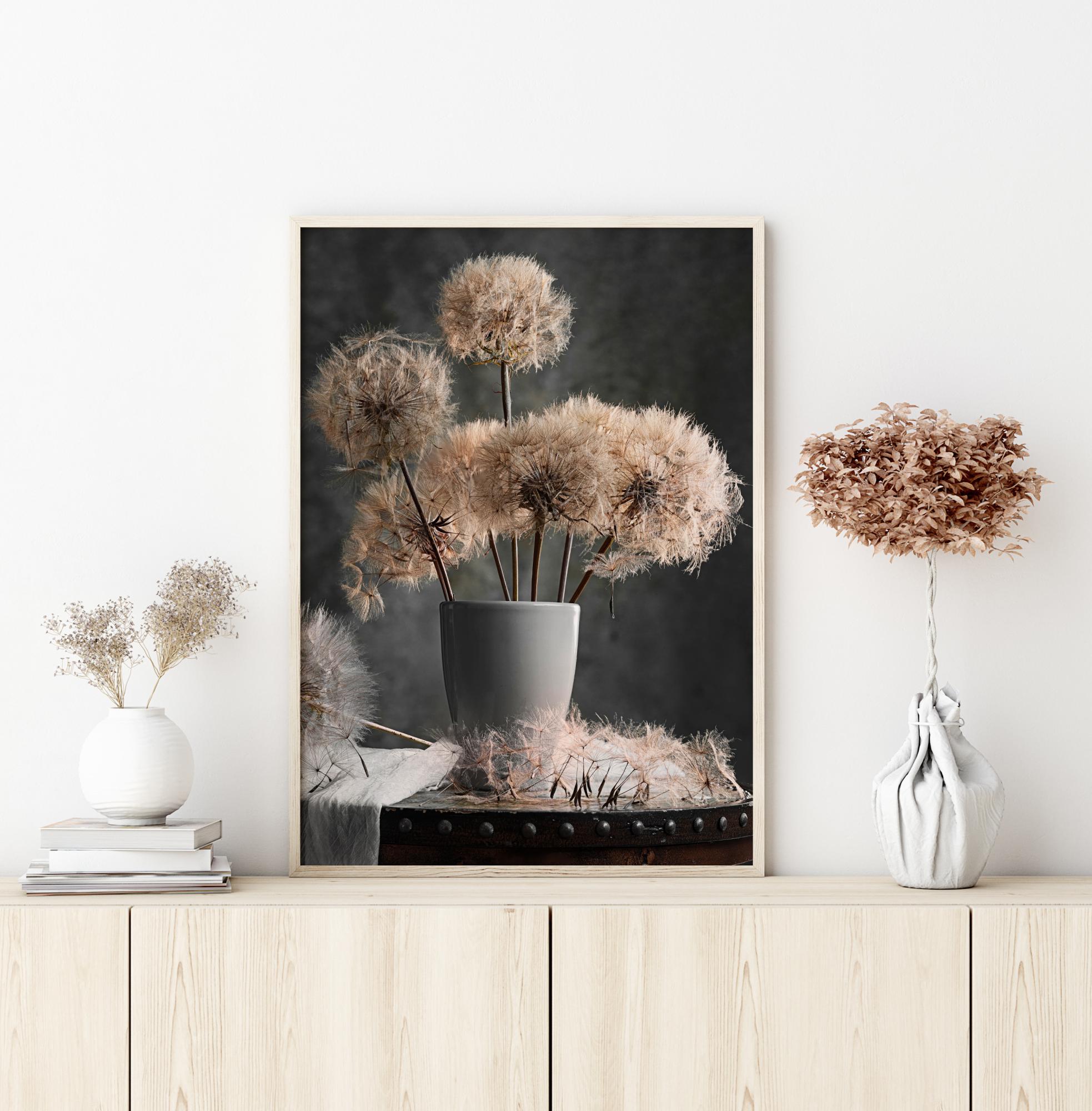 A still life poster of dandelion seed pods in a vase against a dark grey background. The dandelion clocks have begun to fall with the seeds floating around below the still-complete heads. Imagine the passage of time as you stare at these old dandelion clocks.
