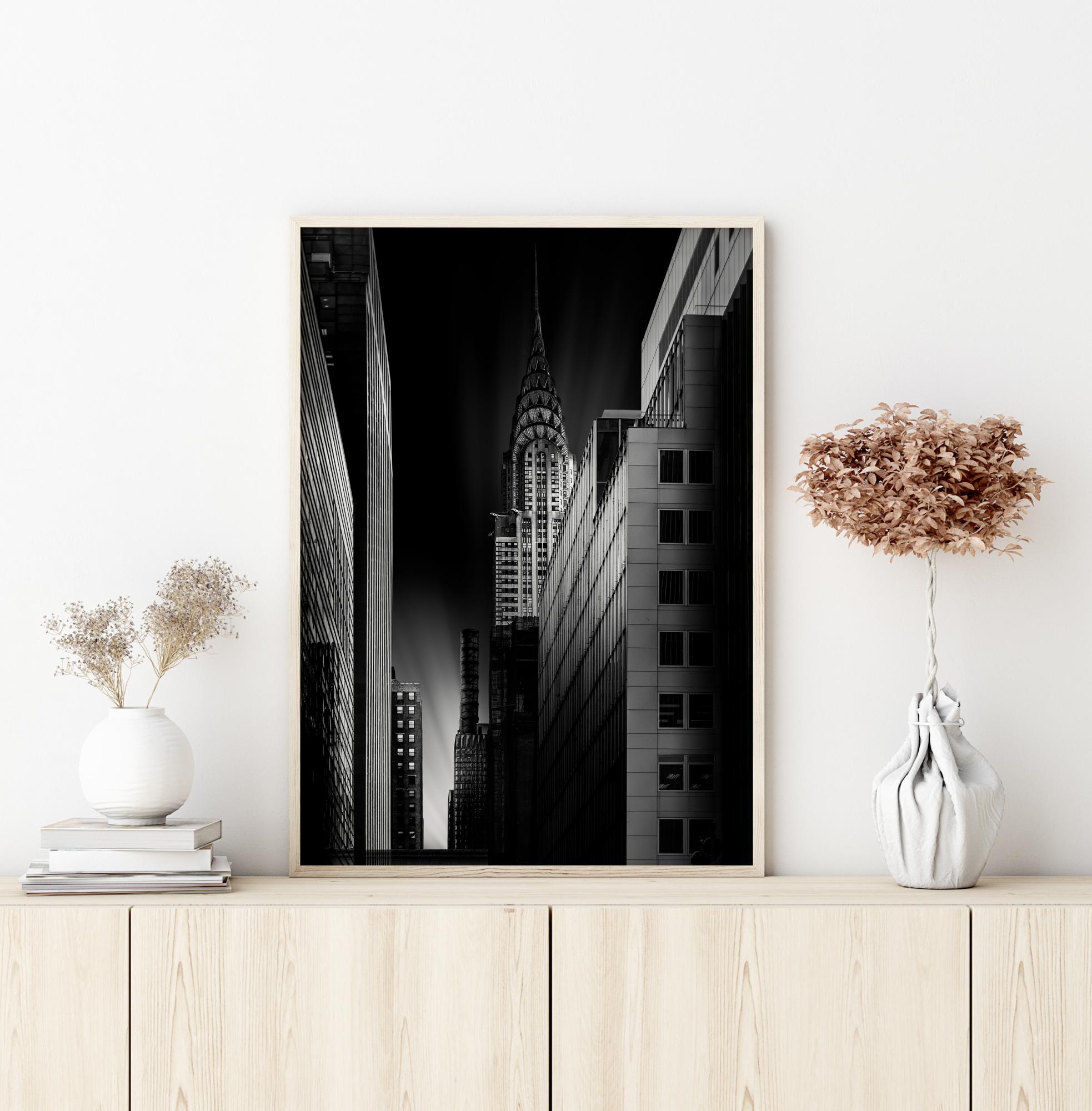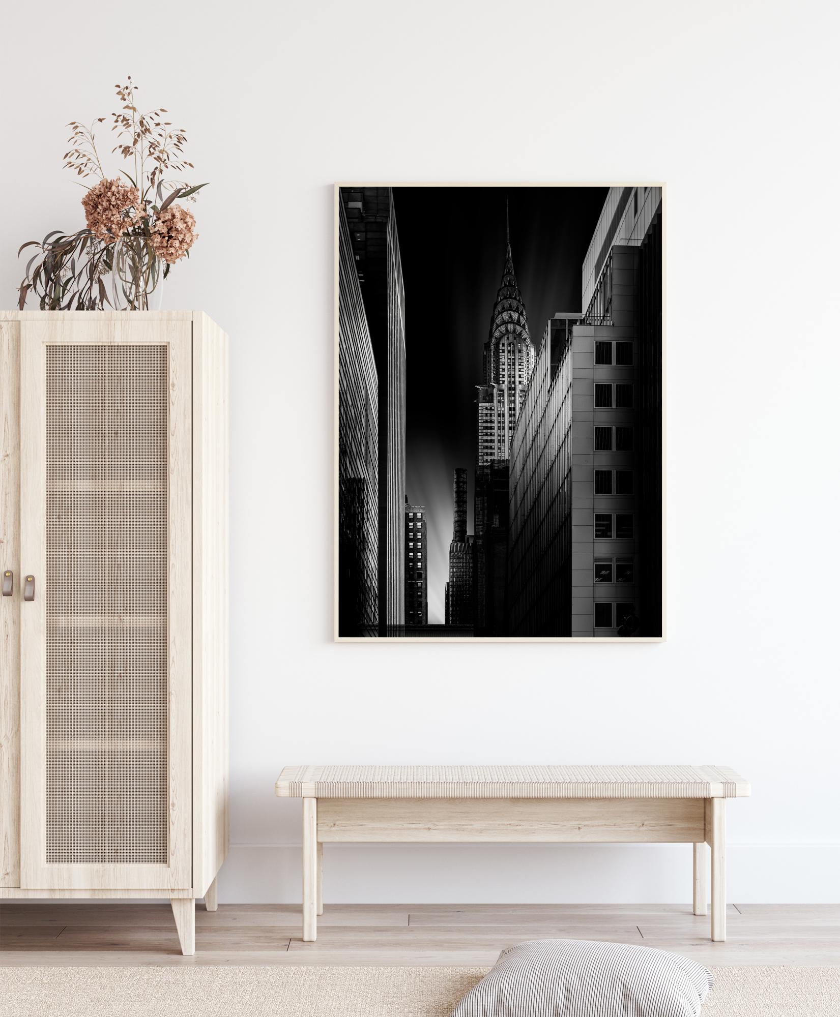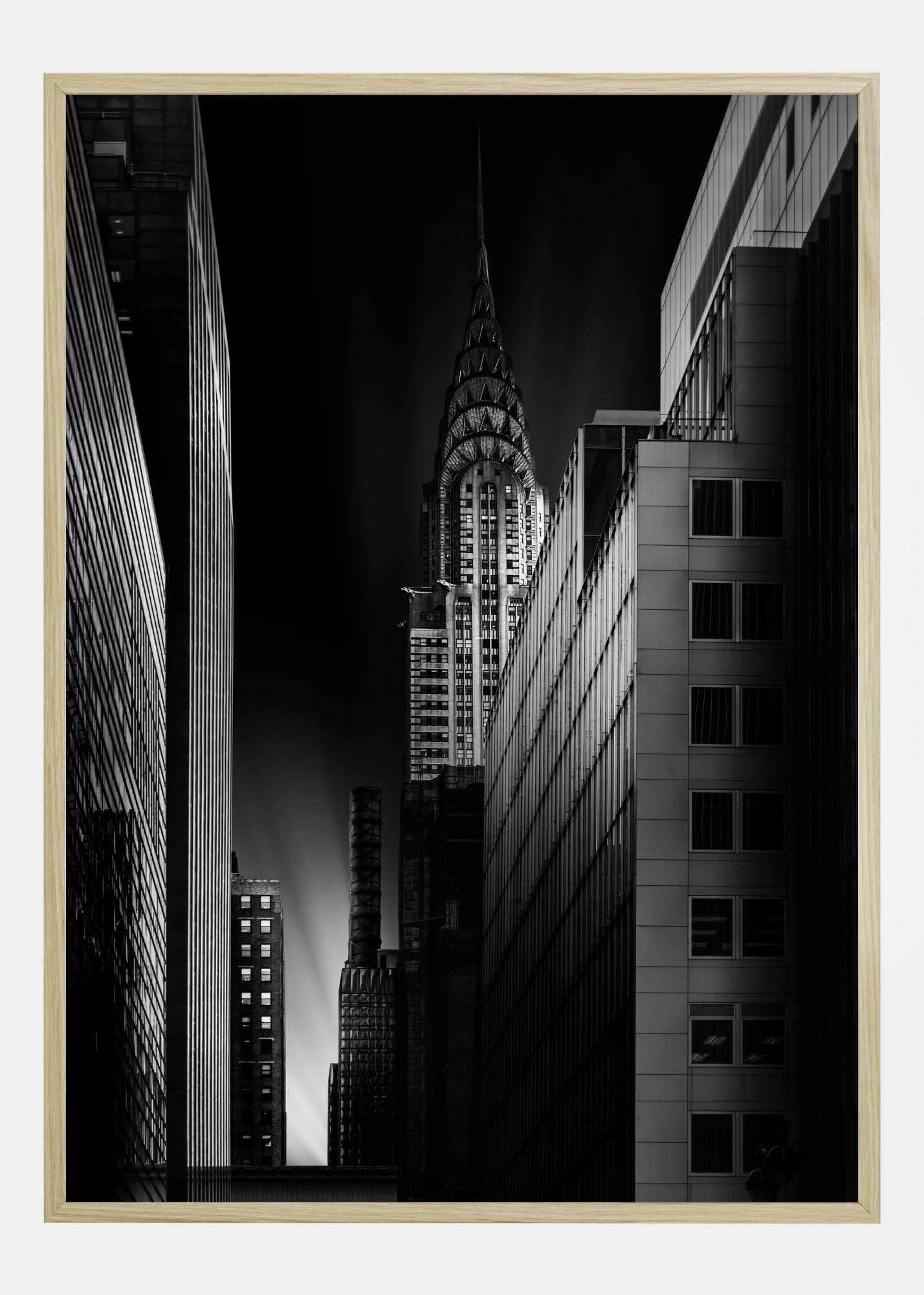 An urban poster of the Chrysler building at night. A narrow street draws the eye down to a bright flare of light hitting the sky. To the right, the shadowy Chrysler building can be seen in this slightly eerie shot. Hang on a white wall for that art gallery feel.