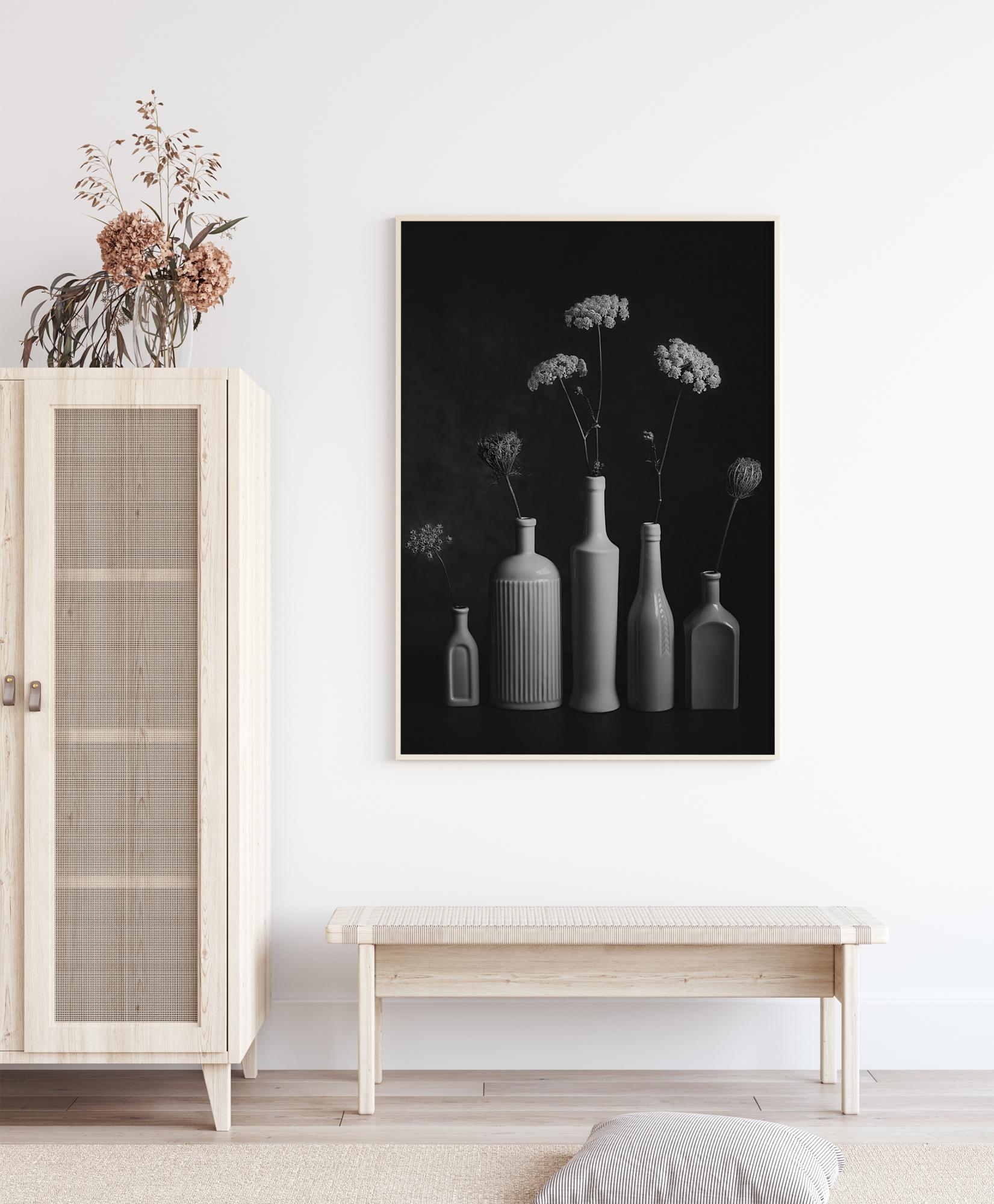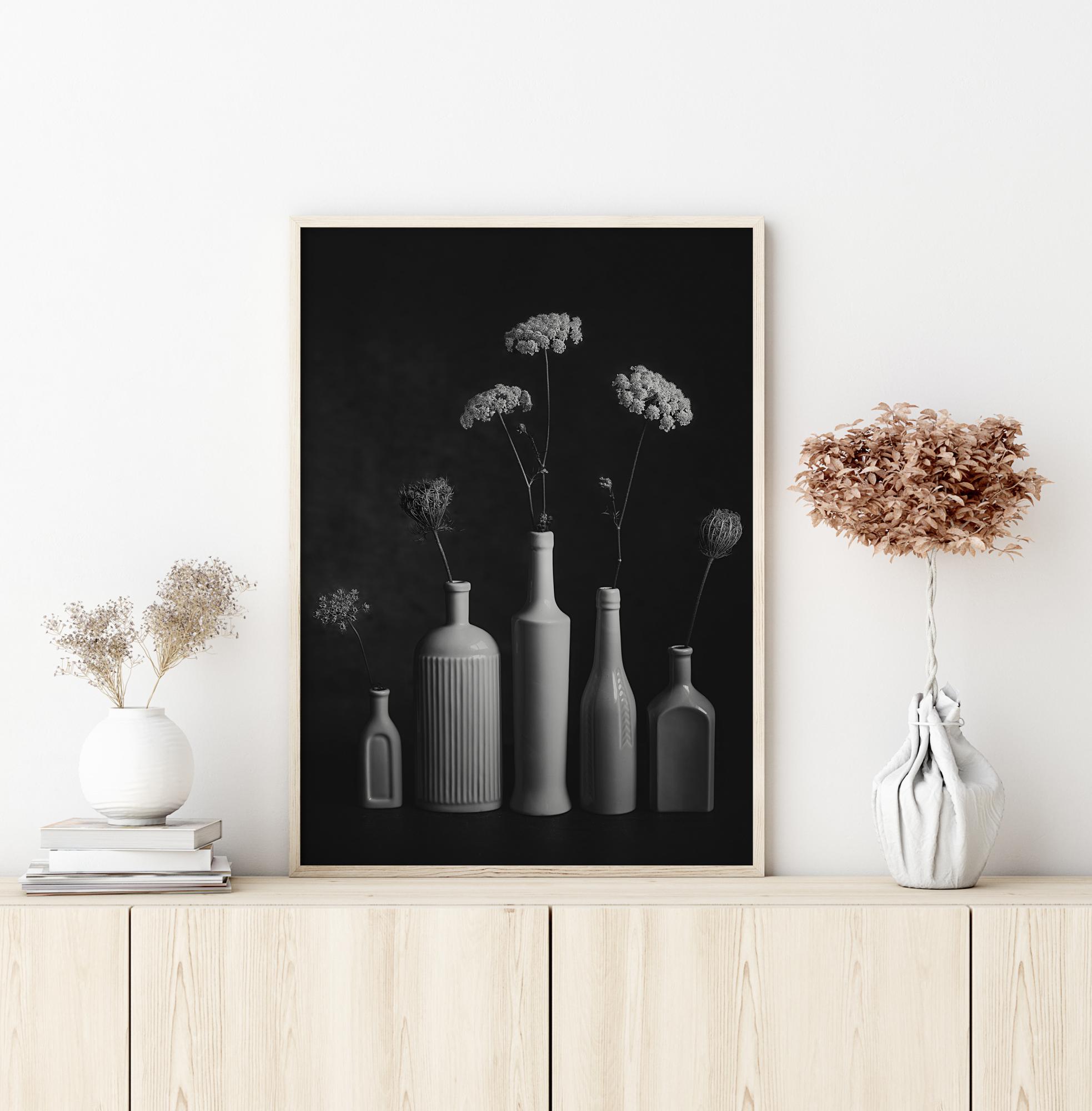 A traditional poster of bottles and flowers against a simple black backdrop. Add a touch of the Dutch painter style to your home with this simple, yet compelling set of bottles and flowers.