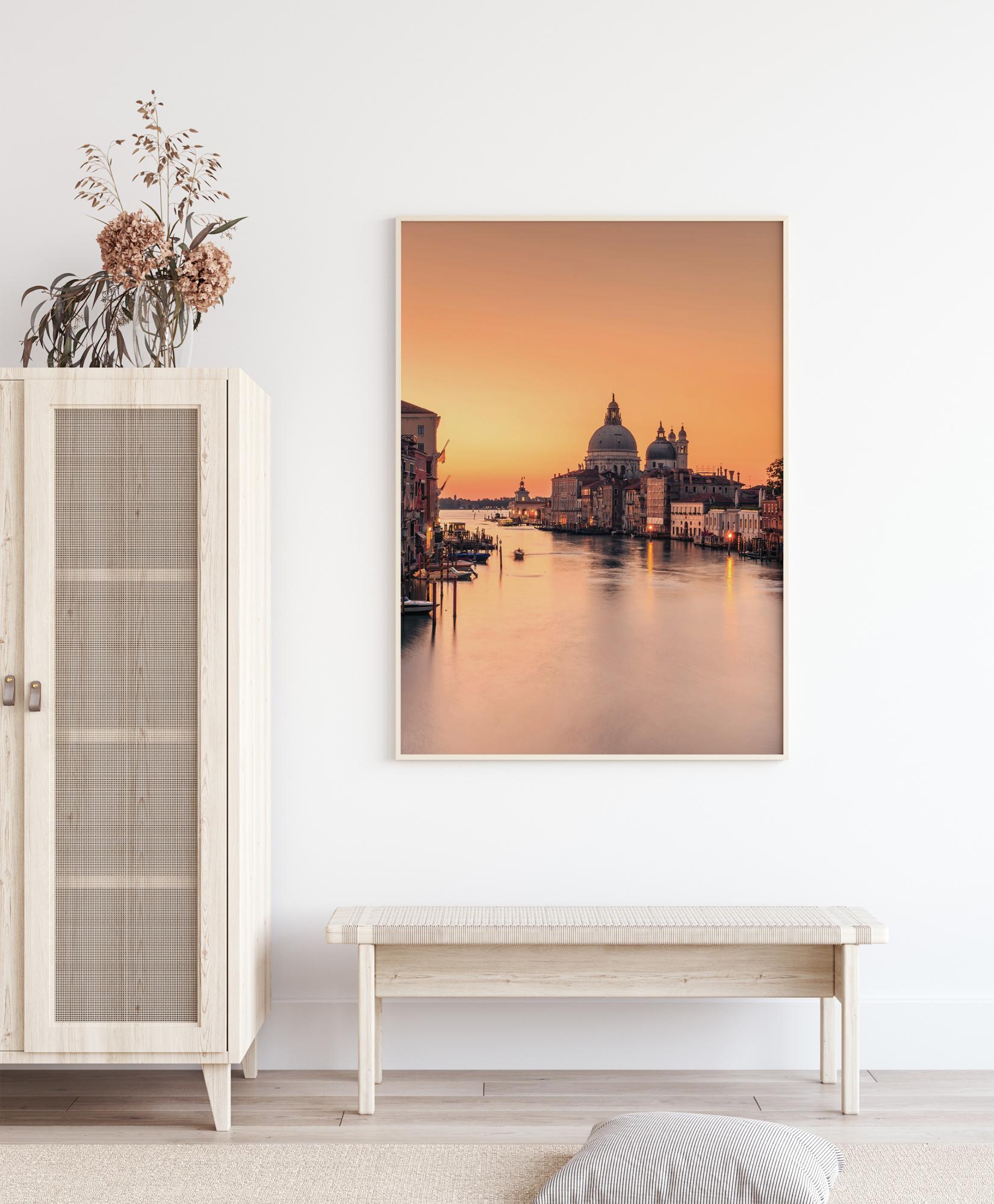 A city poster of dawn in Venice. The wide canal opens up to the sea with the city perched on each side. The sky is a stunning orange as the sun rises over the cathedral dome. Feel the warmth of the new day with this beautiful and peaceful image.