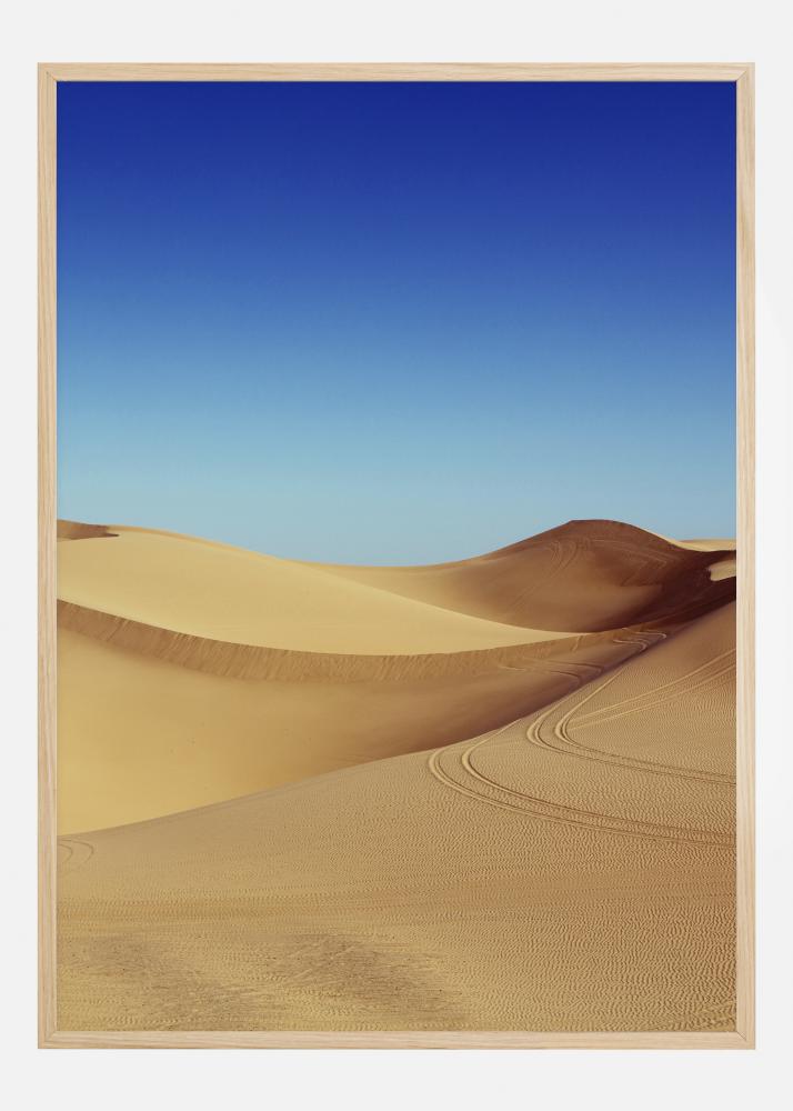 A vibrant poster of stunning yellow dunes with two sets of tyre tracks running around in a curve. The bright dunes are enhanced by the thrilling blueness of the sky. Get lost in this vast open space when you hang this stunning shot on your wall.