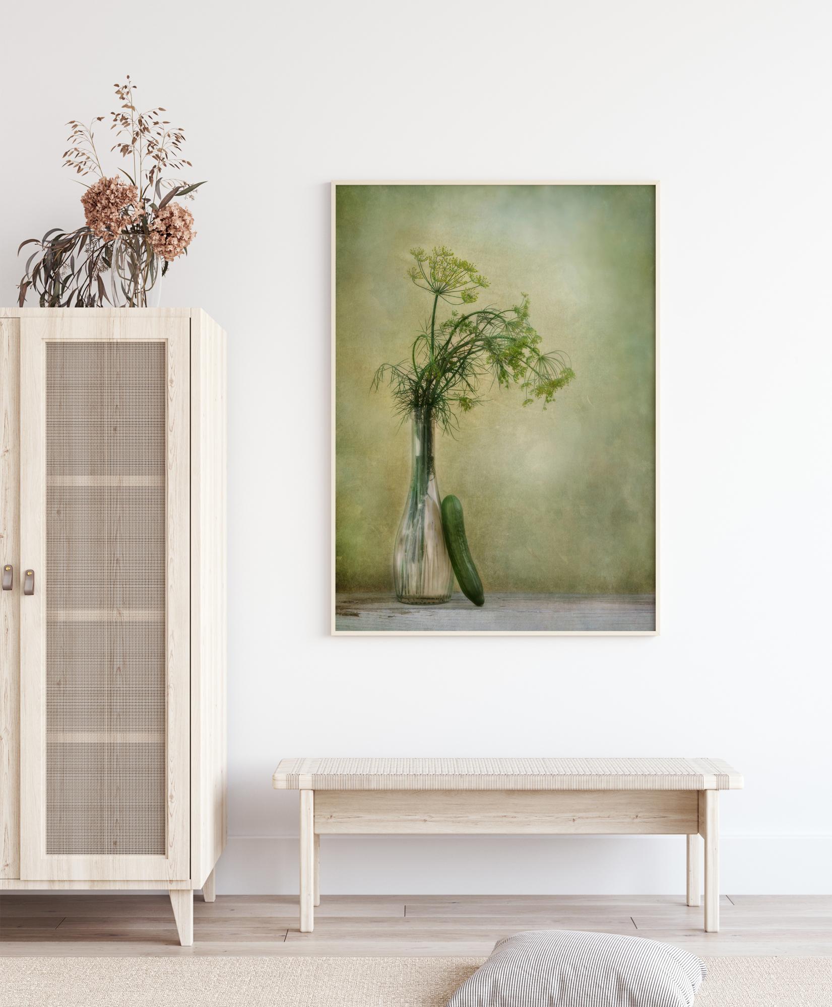 A vegetable poster of dill and a cucumber against a soft green and yellow wall. The glass vase holds the dill sprigs as the cucumber leans against it in this still life image. The soft watercolour style tones in the background are lighter around the leaves, darker towards the borders. Hang this in a kitchen for a cute, veggie vibe.