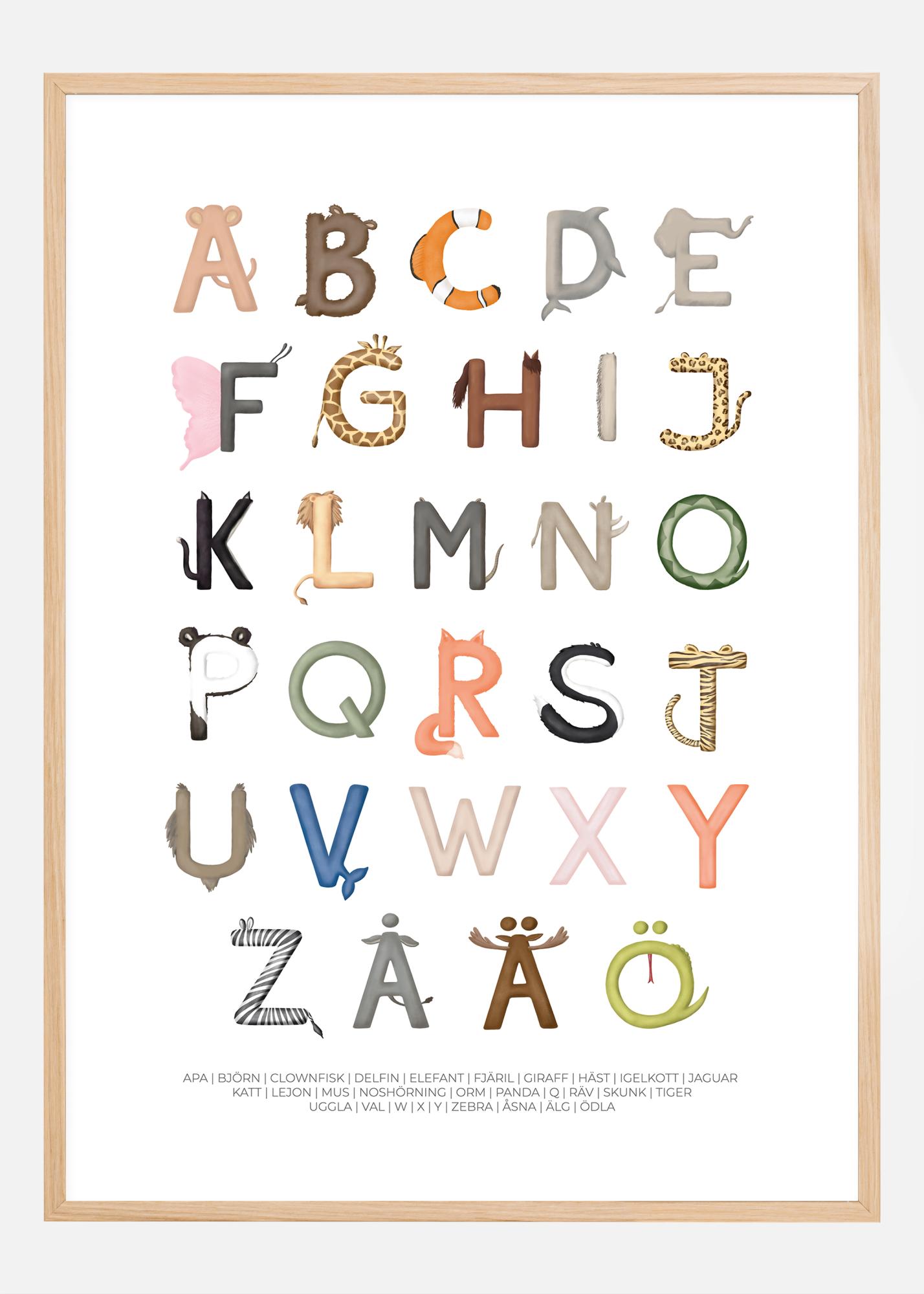 This playful and educational poster is perfect for inspiring curiosity and learning in children. It depicts the alphabet represented through a variety of animals, each letter uniquely shaped to depict an animal that begins with that letter. From 'A' as a monkey to 'Ö' as a lizard, each character is richly illustrated in a clear, friendly, and colorful style. It also includes the three extra letters of the Swedish alphabet: 'Å', 'Ä', and 'Ö', providing a complete linguistic experience.