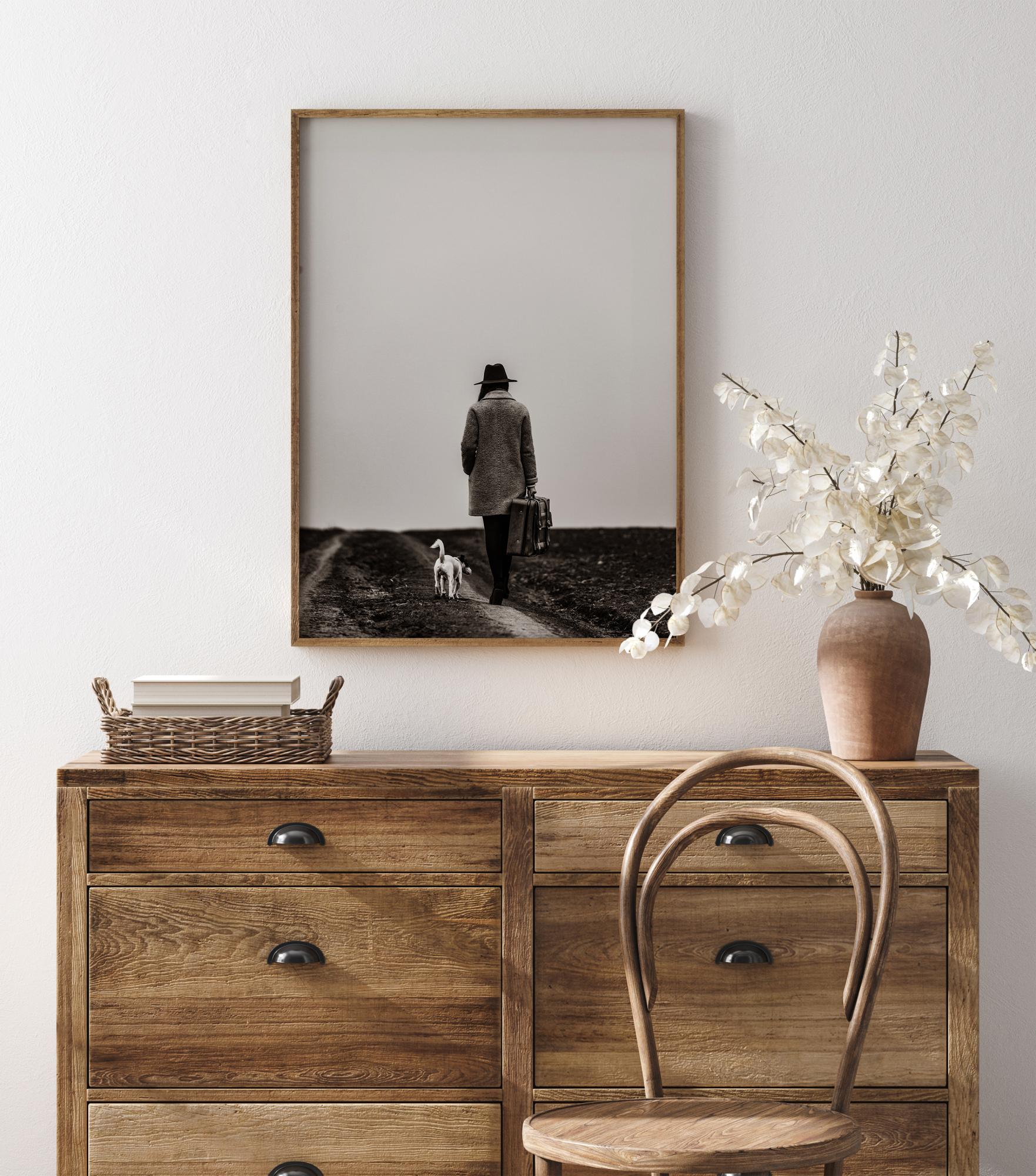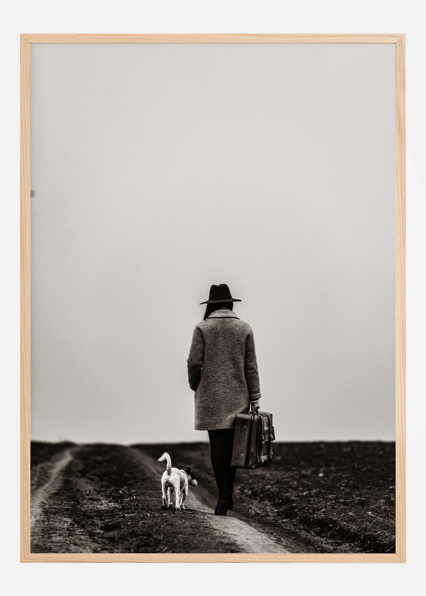 A minimalist poster of a woman walking along a path with her dog. The two lane track leads into the distance as the woman wearing a long jacket carries a suitcase with her terrier. The wide white sky is inviting. Join this woman on her travels when you add this black and white image to your wall.