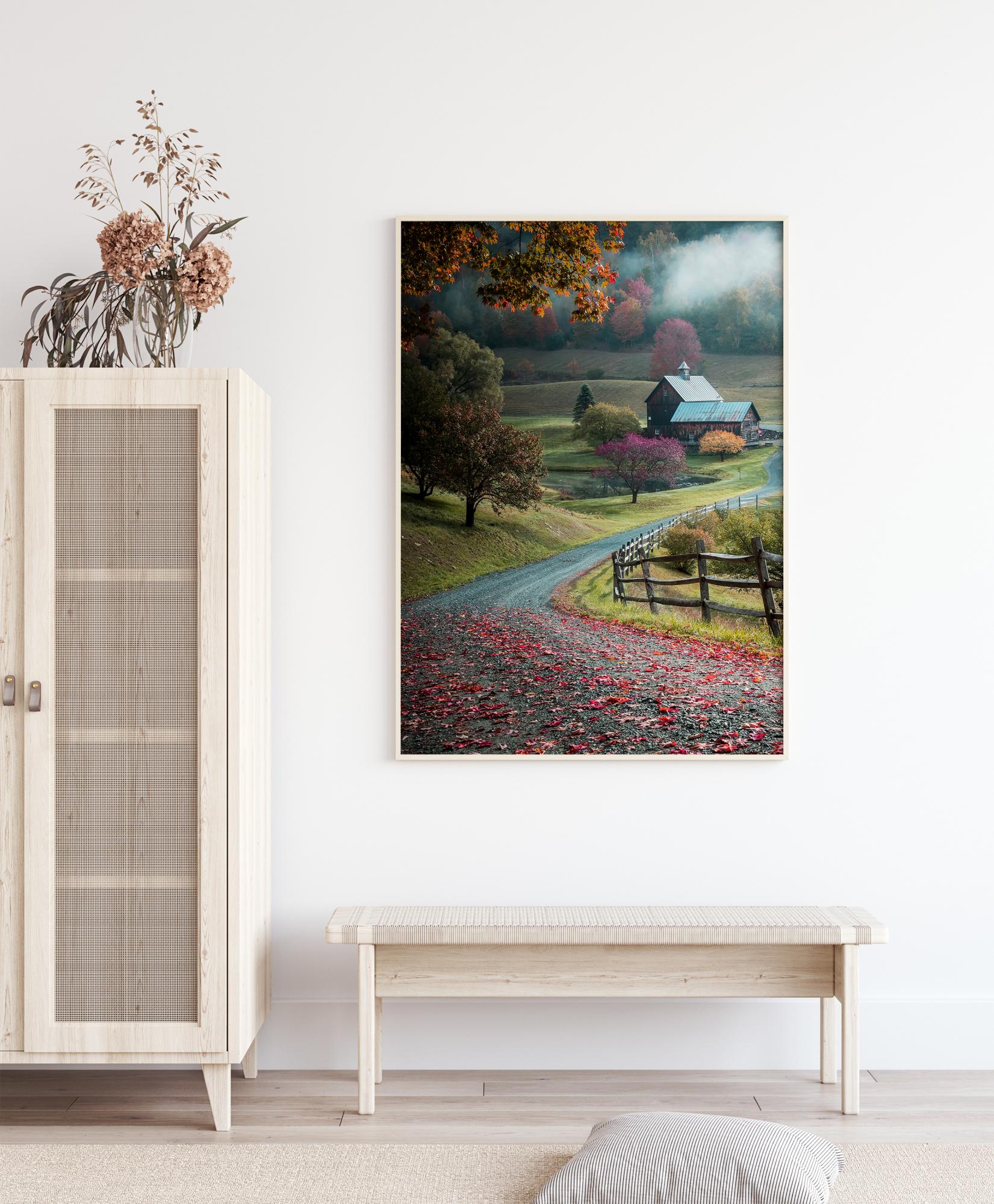 A nature poster of a countryside scene with a lane, idyllic farmhouse and autumnal trees. Red leaves lie across the road that leads into a valley and the small house. A sunbeam cuts across the valley lighting up the autumnal leaves on the tree. Feel the charm when you bring this home.