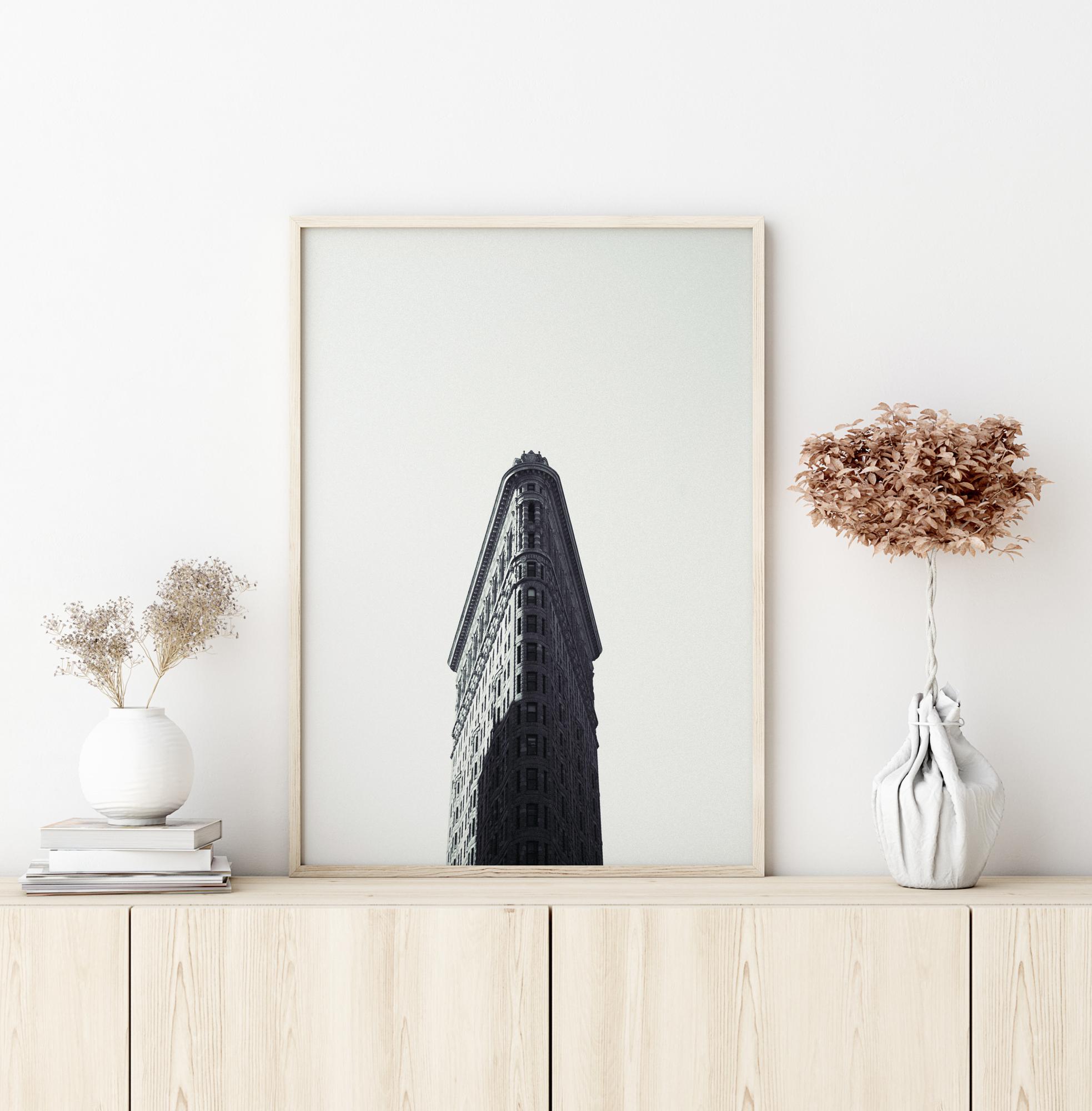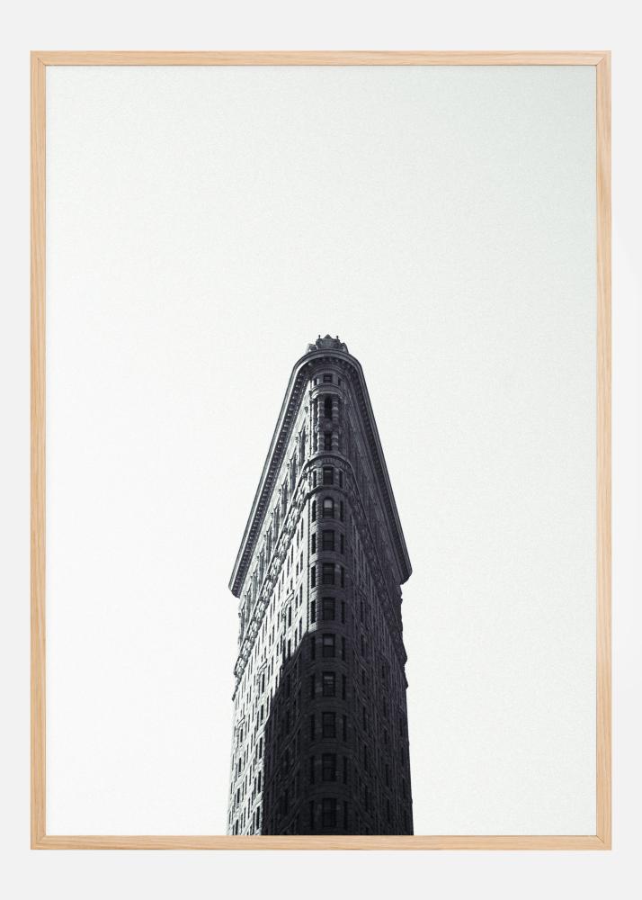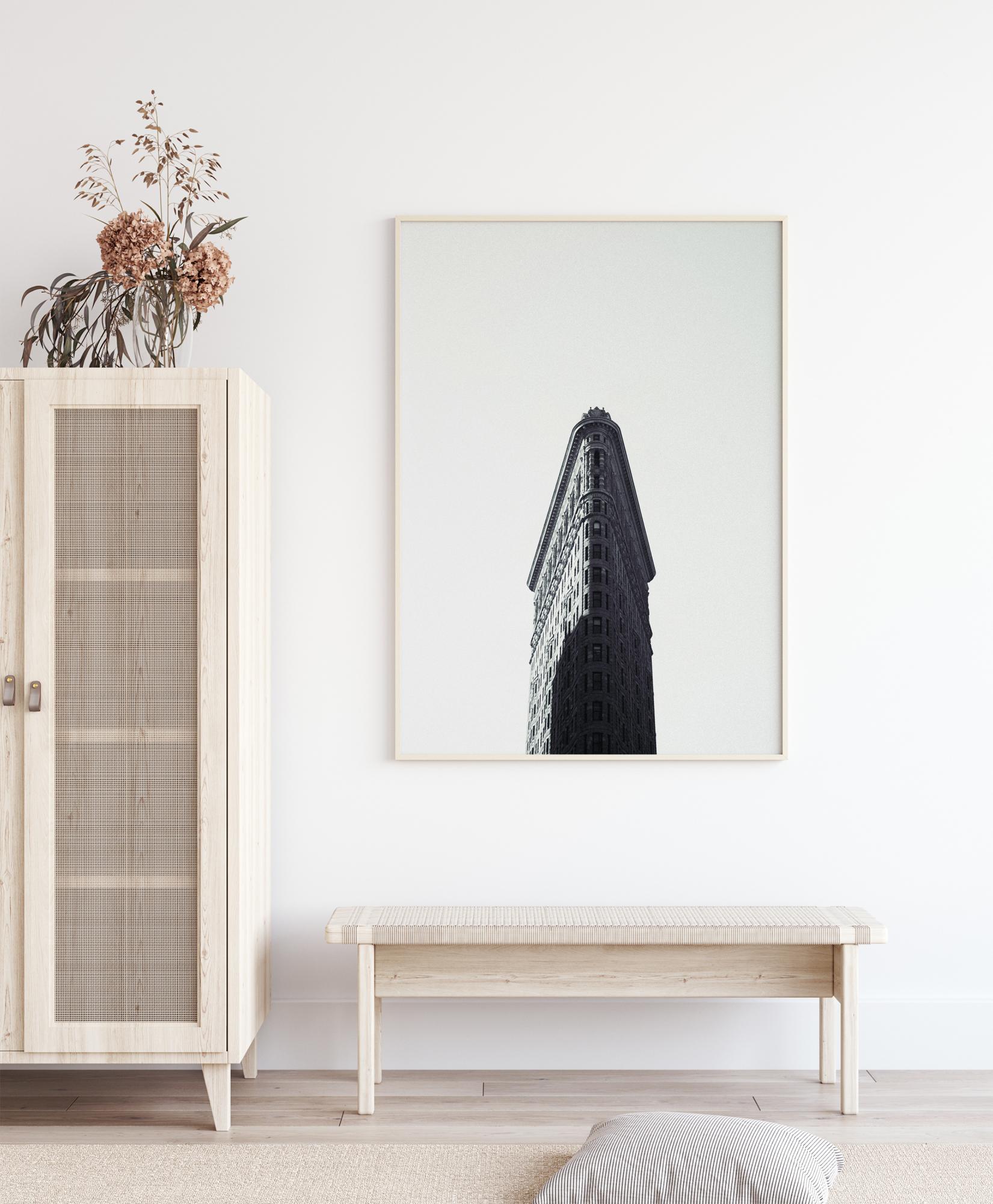 An architectural poster featuring the front corner of a block of old flats. The front of the building looks like the prow of a shp standing out strong against the plain white sky. The triangle shape draws the eye in and up through the building. Add this on a block colour wall for an artistic vibe.