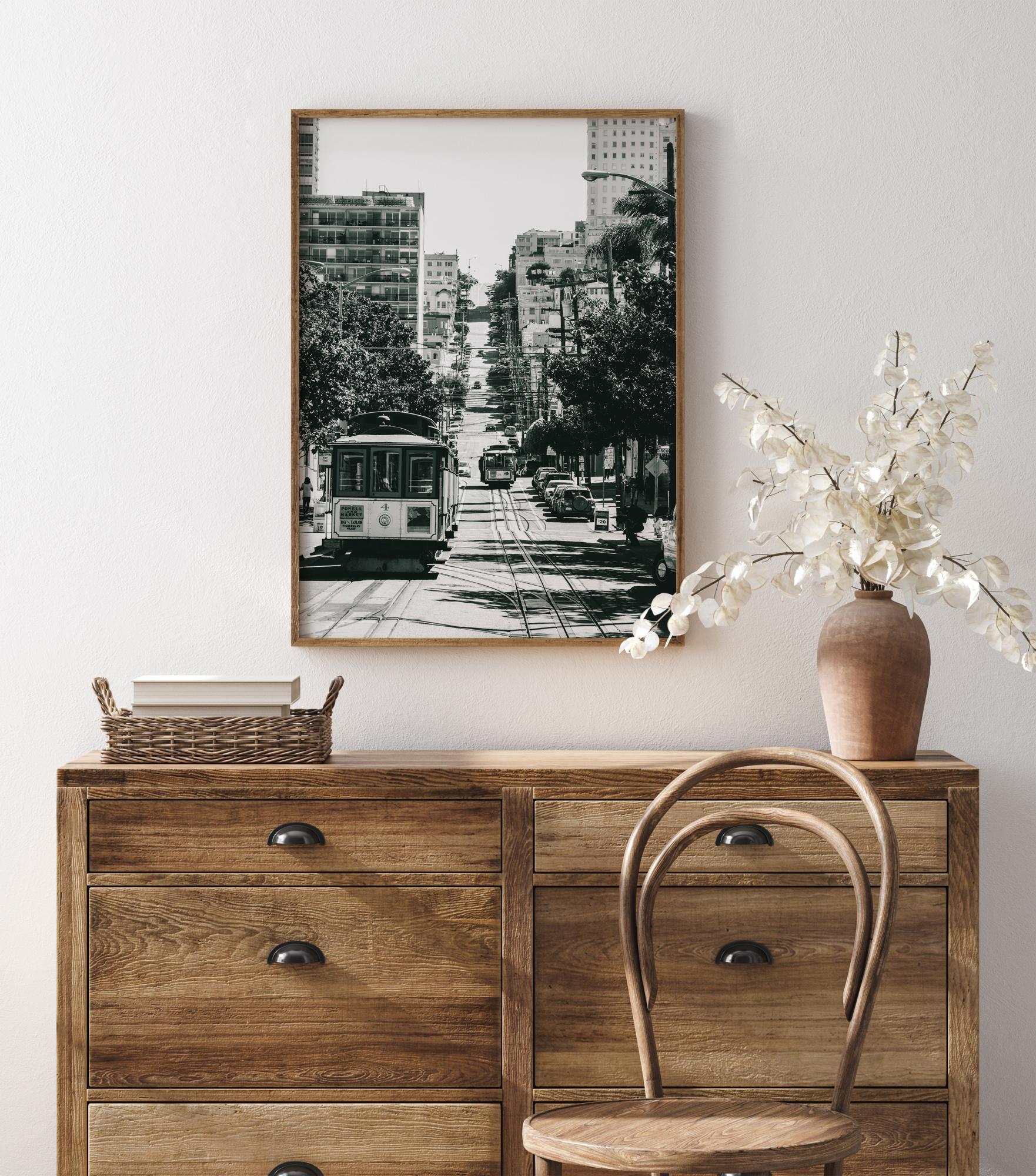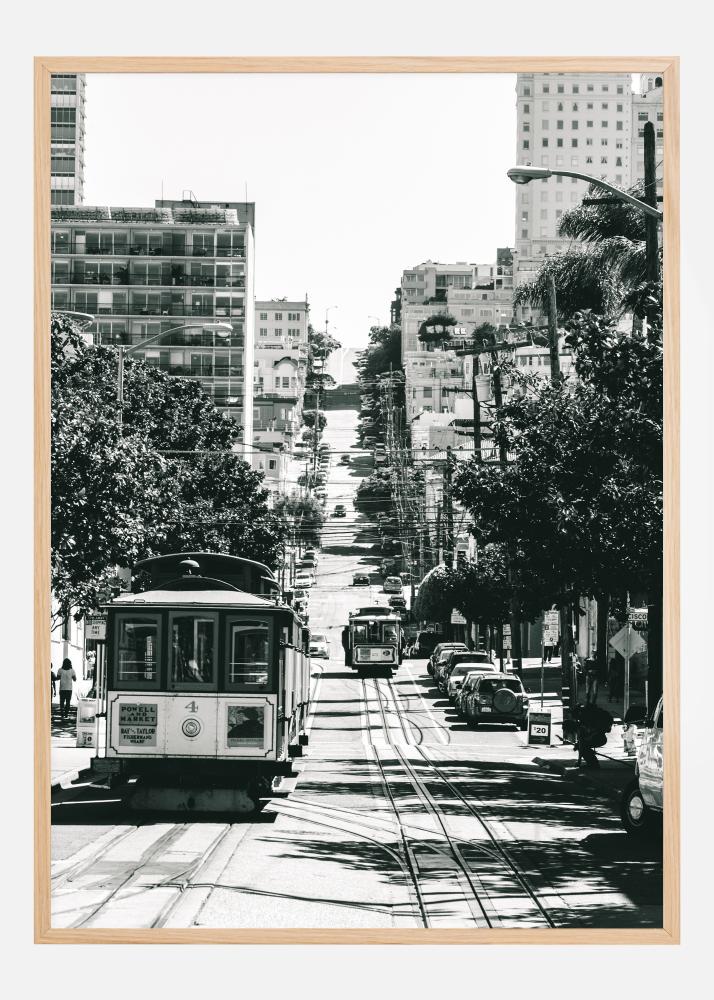 A cityscape poster featuring downtown San Francisco. A tram sits in the foreground as it makes its way up the hill through the houses and trees on each side. This black and white print adds a touch of class to any wall you choose to hang it on at home.