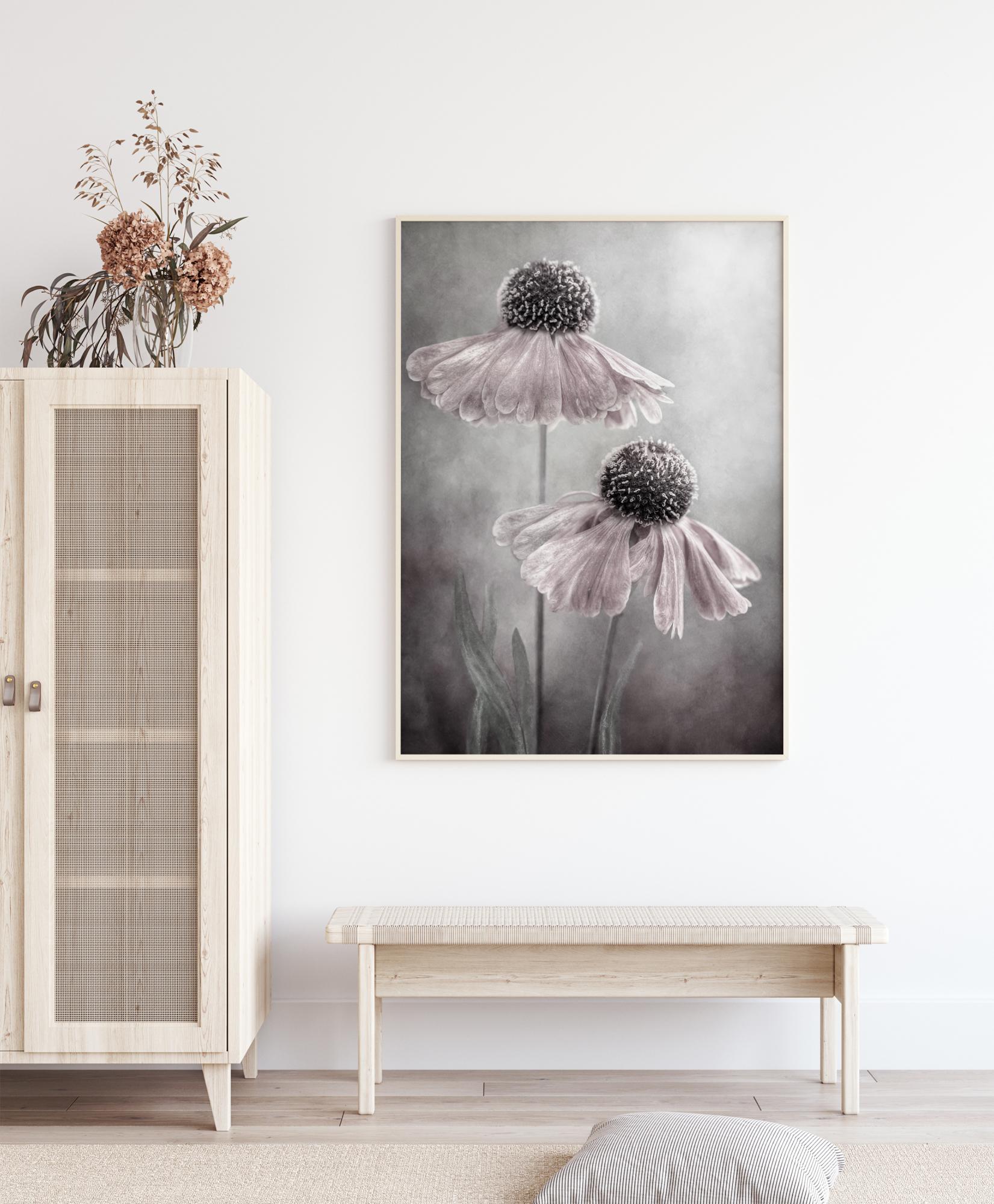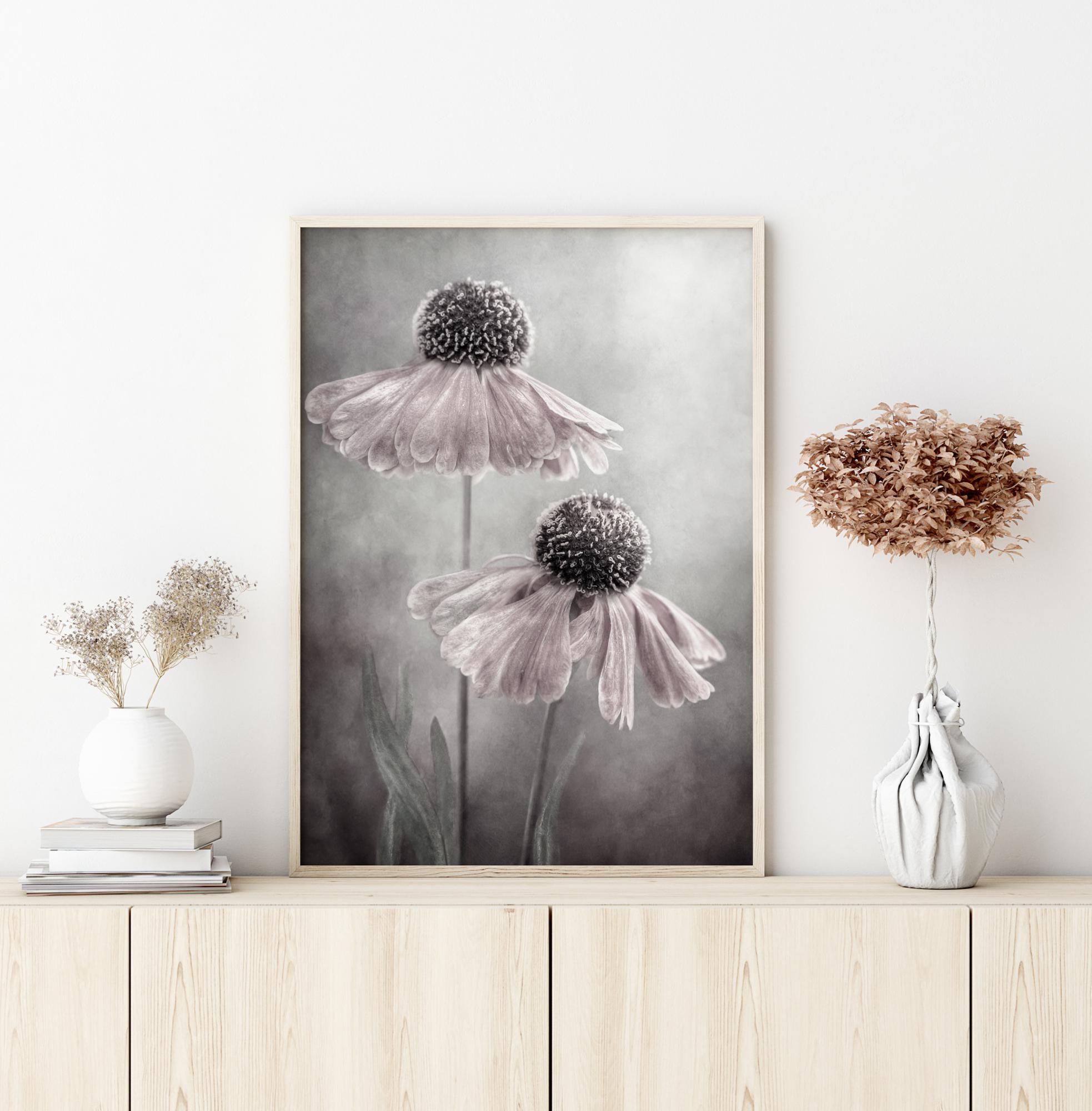 A beautiful poster of two daisies as they reach up toward the sky. The white petals of each daisy head droop down around the spherical flower centre. The background is a misty grey tone with the light shining through for ambience. Feel the magic in this delicate poster when you hang this in a bedroom.