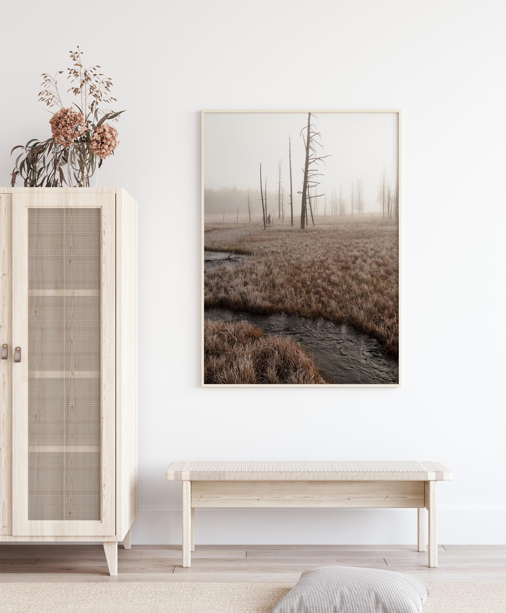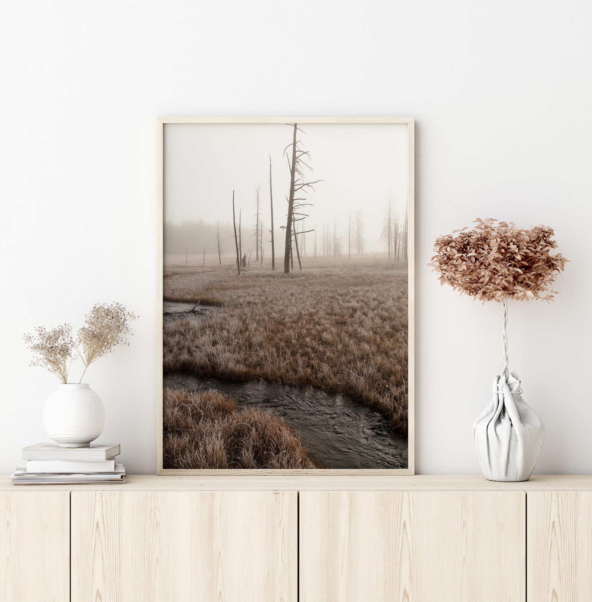 An ethereal landscape poster of a plain with dead trees and a stream running through it. This early morning shot has mist shrouding the trees and the yellow grass. Follow the stream as it winds through the landscape into the distance to the far off forest. Get lost in another time and place when you hang this up.