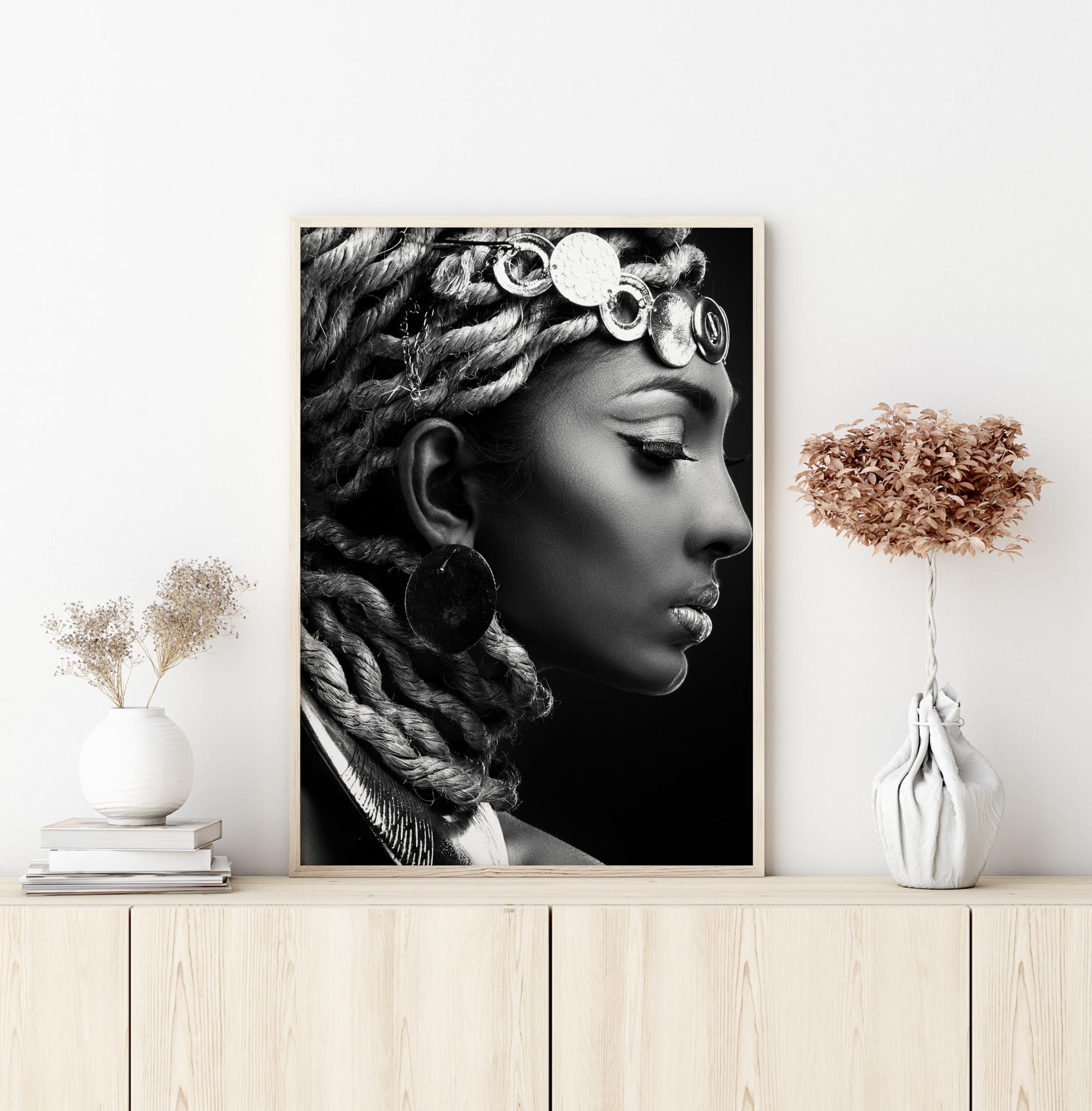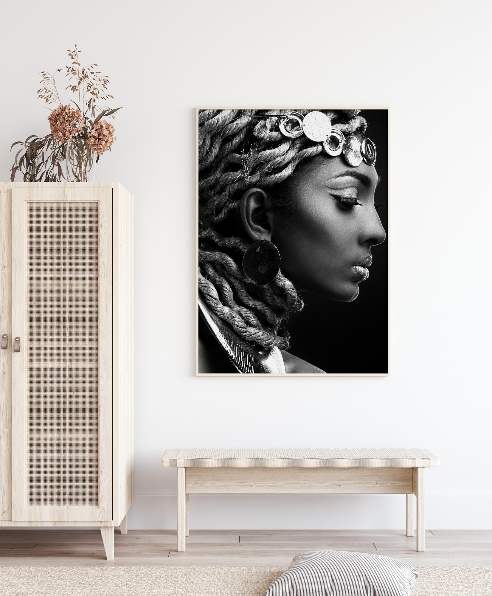 A stunning portrait poster of a woman's profile as she dresses in ancient Egyptian style. This black and white image creates a sense of drama as this beautiful woman imperiously looks down. Her head, ears and neck are covered in large golden jewellery, a symbol of wealth. Get inspired each day by this strong woman.