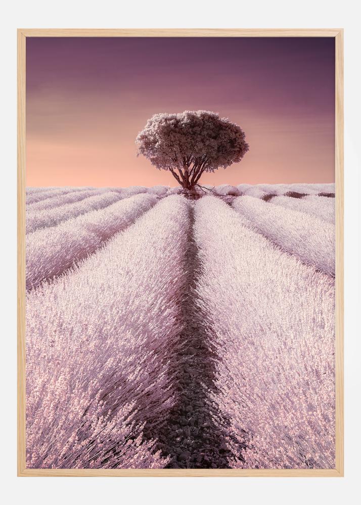 Step into a dream world of color and fantasy with our exclusive poster. This print exudes a magical feeling with its pastel-colored sky transitioning from warm pink to soothing purple shades. The motif highlights a solitary tree, majestically centered along the clean line of a lavender field's pathway. This poster is a visual feast for the eyes and would fit perfectly as a centerpiece in any room, adding a touch of calm and beauty.