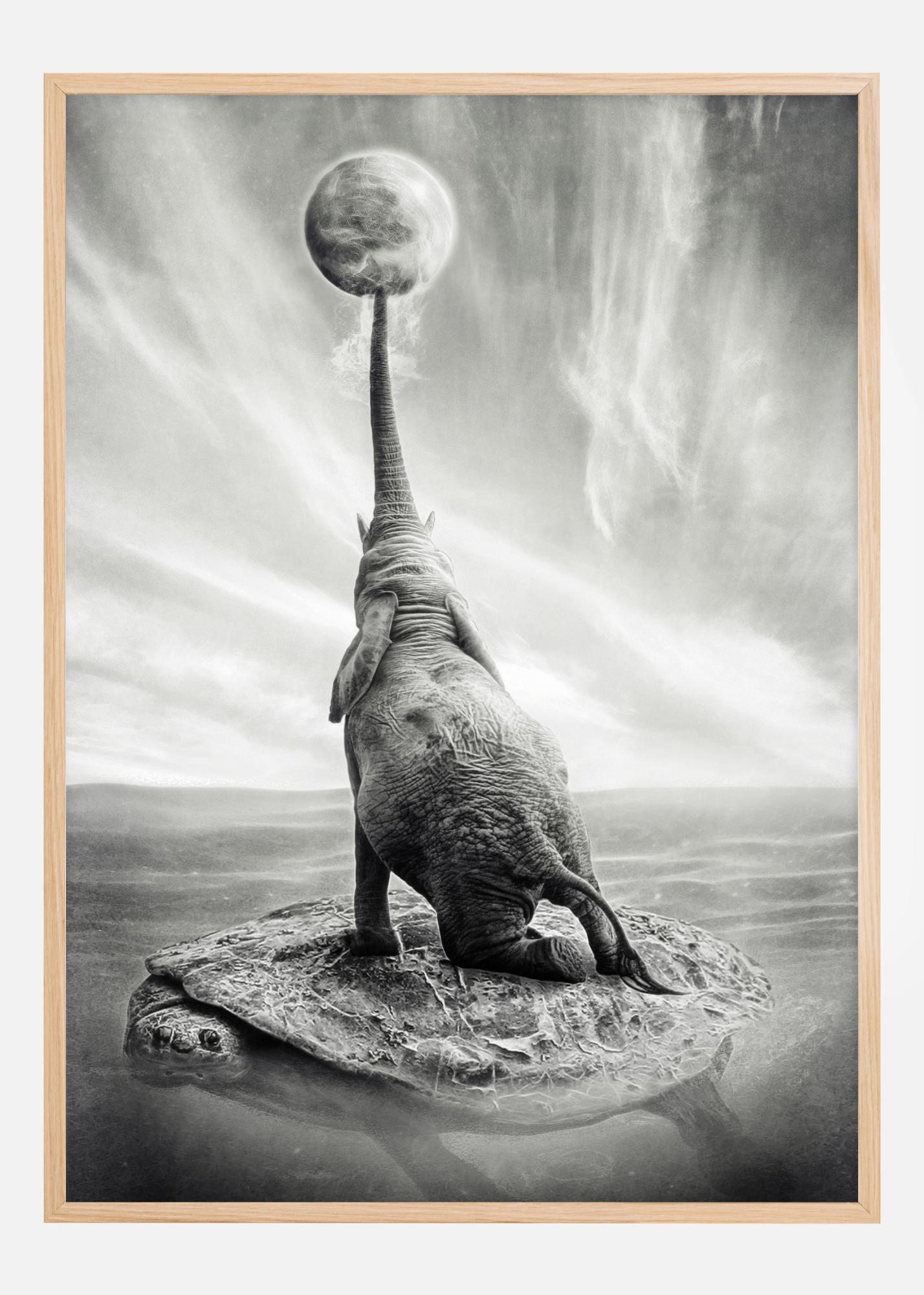 This fascinating black and white poster captures a surreal image of an elephant standing on a turtle and balancing a globe on its trunk. The image radiates powerful symbolism and plays with elements of mythology and fantasy. The textured skin of the elephant and turtle, detailed and prominent, adds an almost tactile dimension to the work, while the blurred background of clouds and landscape contributes to a dreamy and ethereal atmosphere.