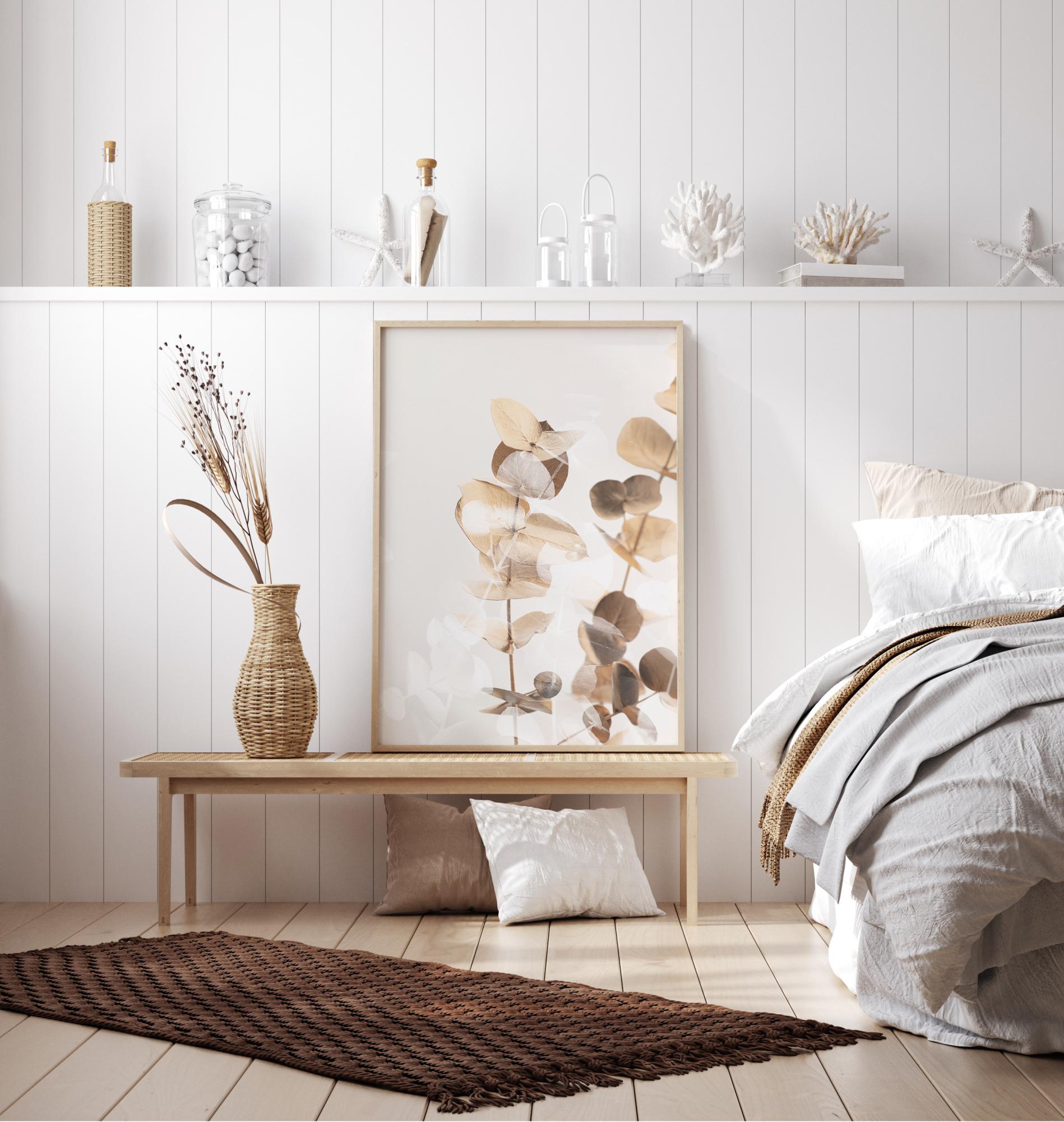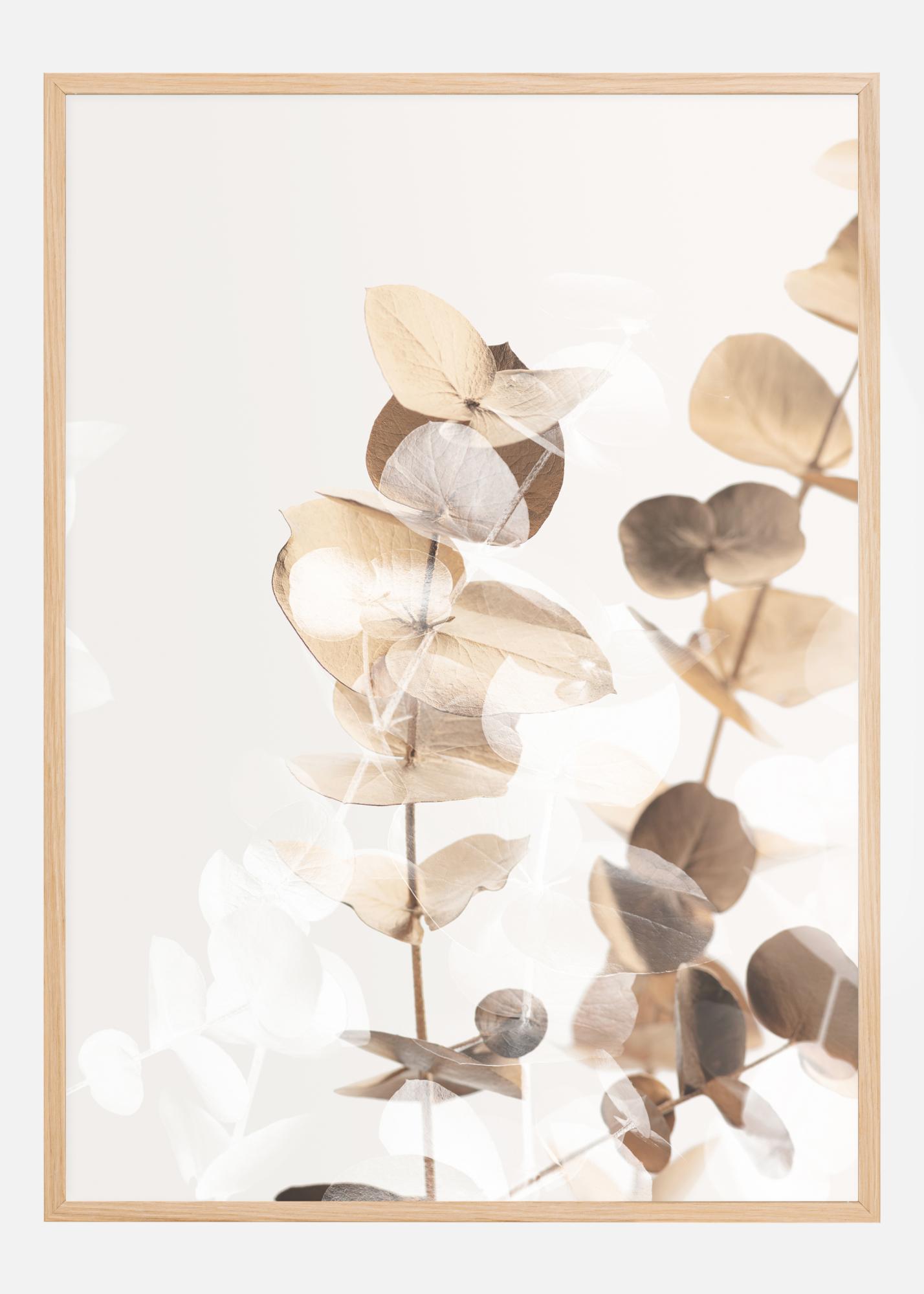 A golden poster of eucalyptus leaves and branches. The gold and brown leaves stand out in shimmering form against the simple white background. To make these leaves bolder, match with a similar gold or dark cream wall for added elegance.