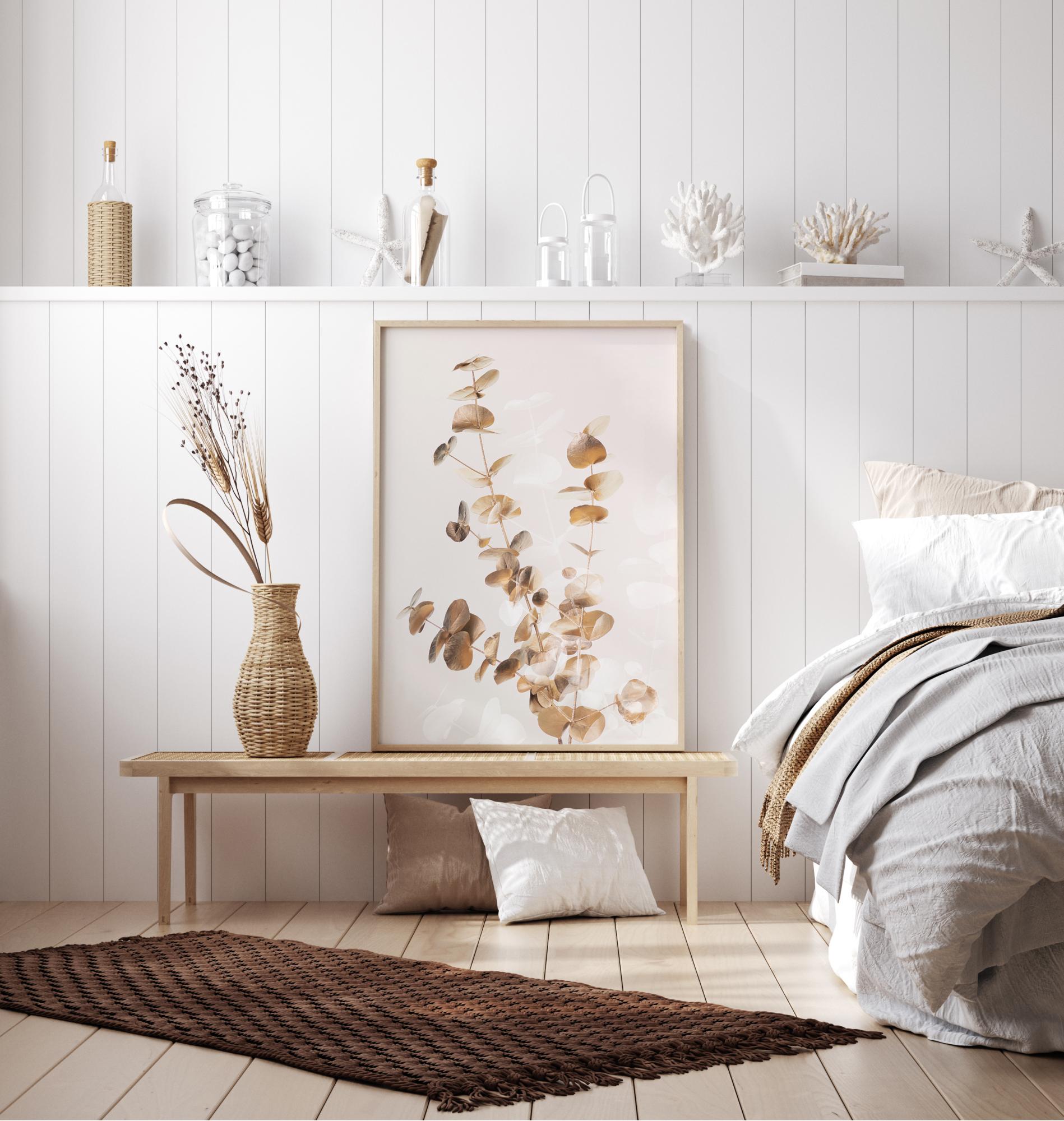 A delightful poster of sprigs of golden eucalyptus. The gold and brown leaves are soft as they stand out from the white background. The leaves are round creating nice shapes in the image. This poster provides a calm, uncluttered vibe to your home.