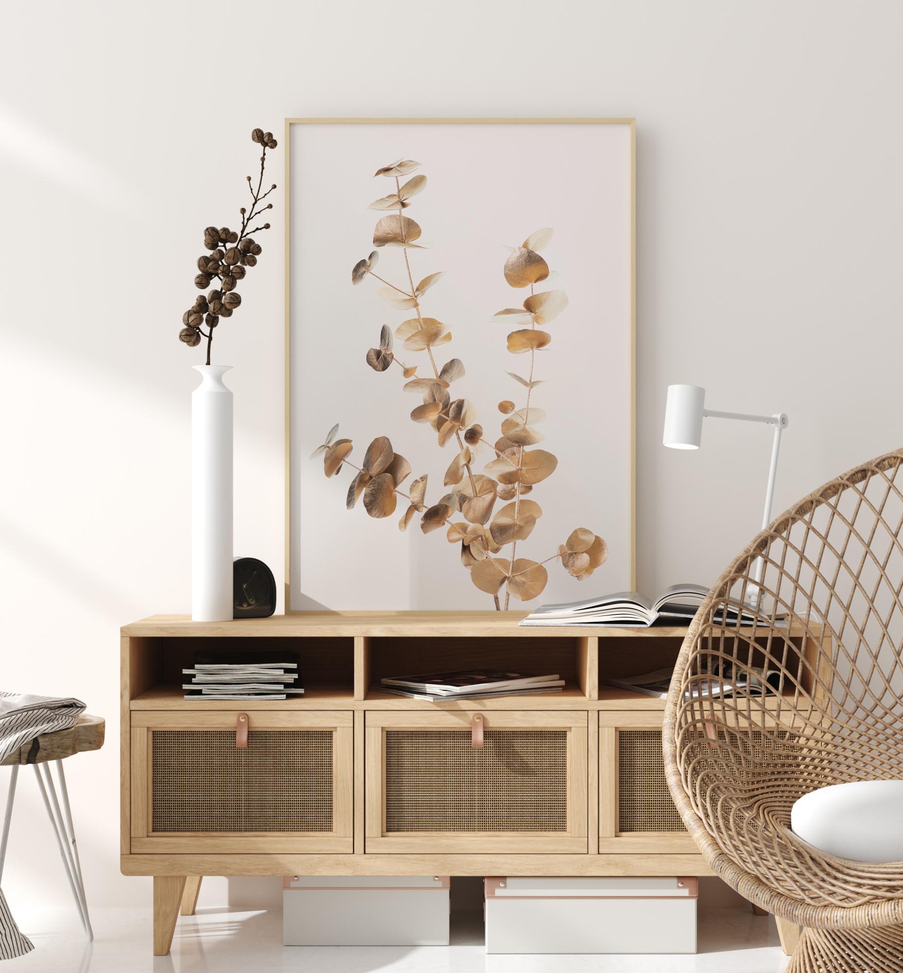 A simple poster of several golden branches of eucalyptus leaves. The golds and browns are soothing and relaxing. The branches sit on a simple white background so that the strong gold stands out for a dramatic, yet elegant effect in your home.