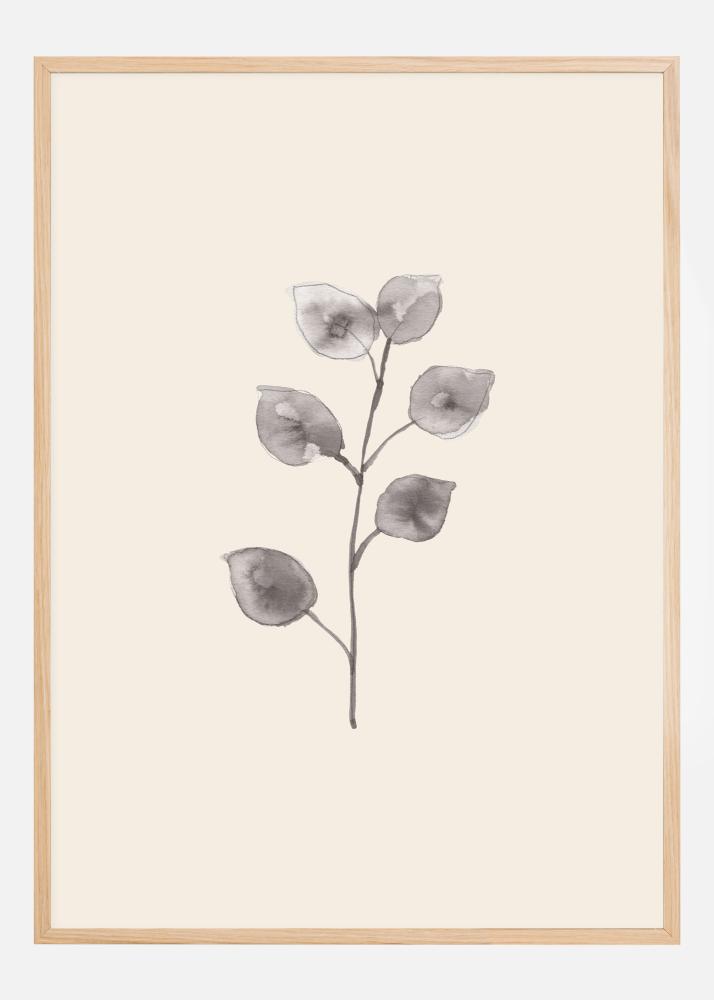 An elegant poster of a simple painting of a branch of eucalyptus. The leaves are done in a watercolour style so that they are soft, the edges almost blurred. In a simple grey, the leaves stand out from the white background. Add this on a green wall for a touch of colour.