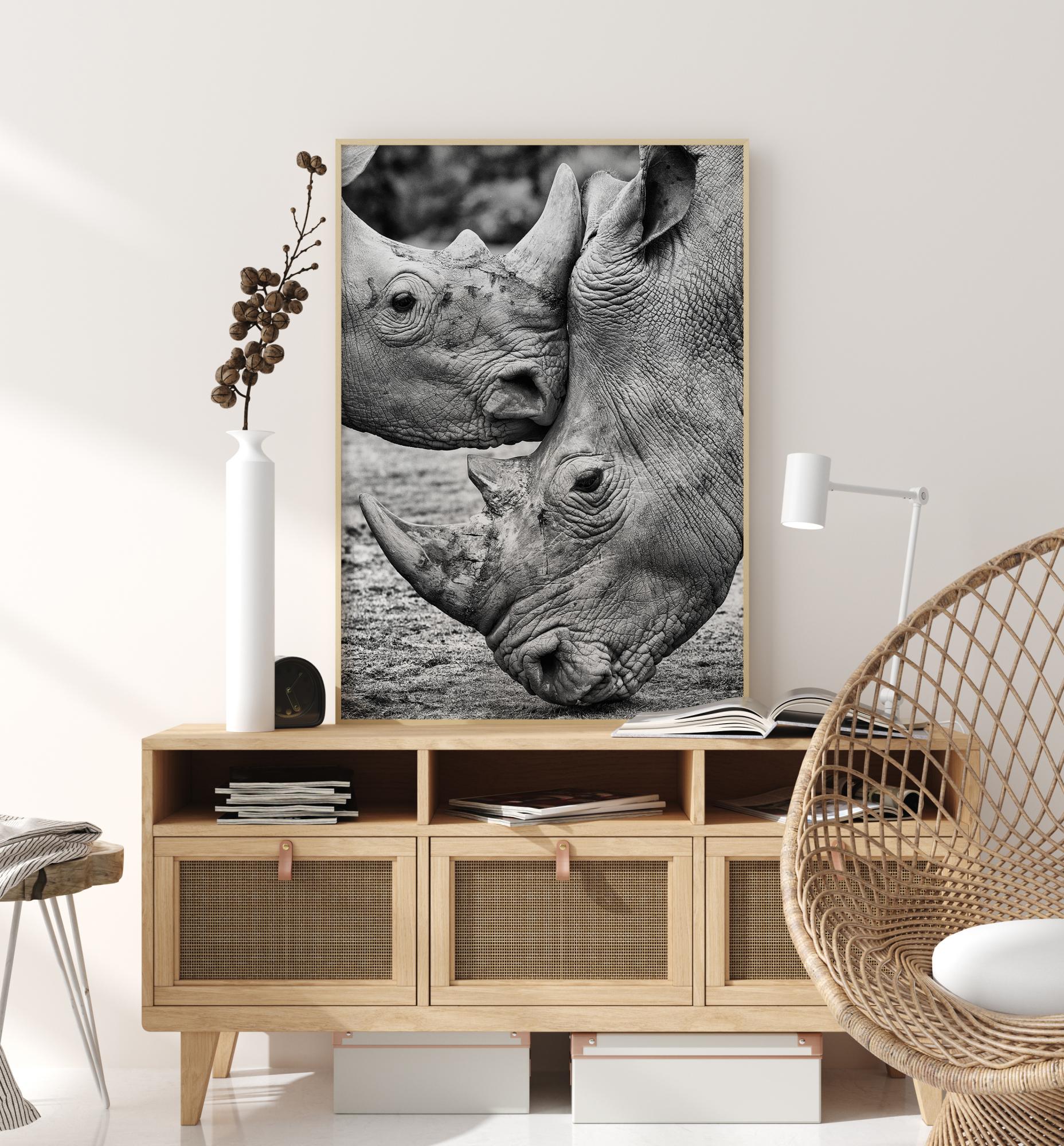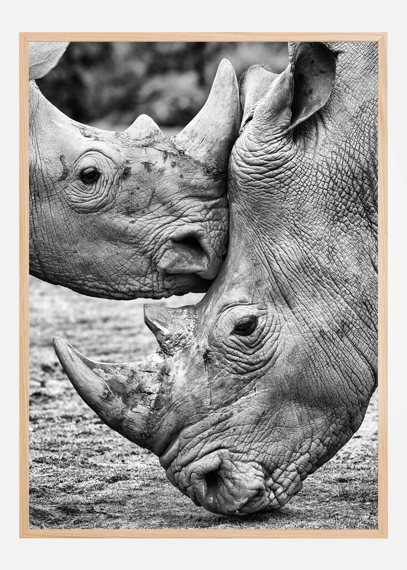 A majestic poster of two rhinos coming face to face. Bring the awe and wonder of nature into your home with this stunning print. Feel and enjoy the tranquility with this poster.