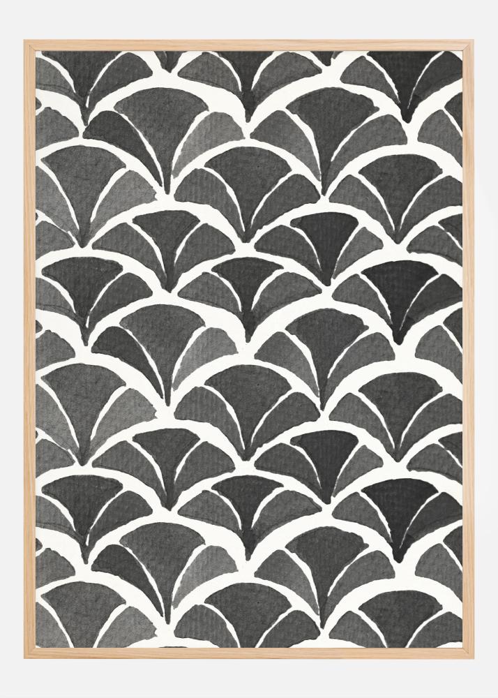 Give your space a touch of artistic elegance with this poster featuring a captivating pattern of leaf feathers in black and white. This print has a repeating pattern reminiscent of vintage fans, rhythmically arranged across the surface to create a sense of movement and symmetry. The sleek contrast between black and white gives a classic look that fits into many different interior styles and environments.