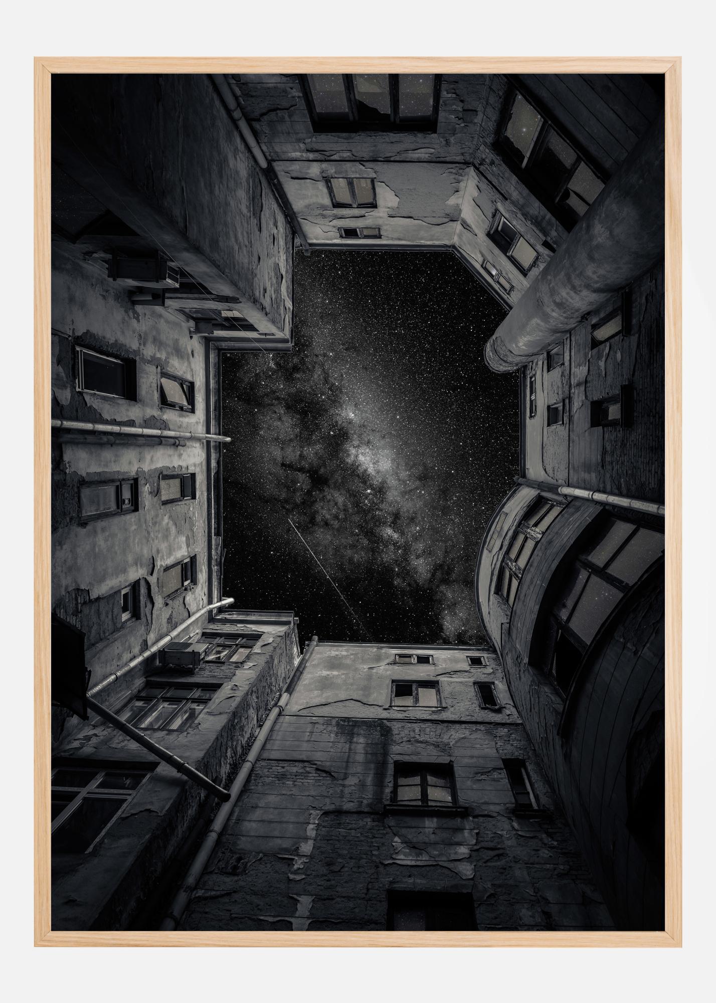 The poster combines the architectural beauty of the city with the natural beauty of the cosmos, creating a suggestive contrast between the urban and the universal. The monochrome colour scheme with its shades of black, white, and grey makes the image easy to integrate into various interior styles and it would be an interesting conversation starter in any room.