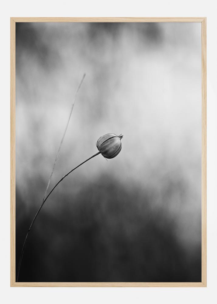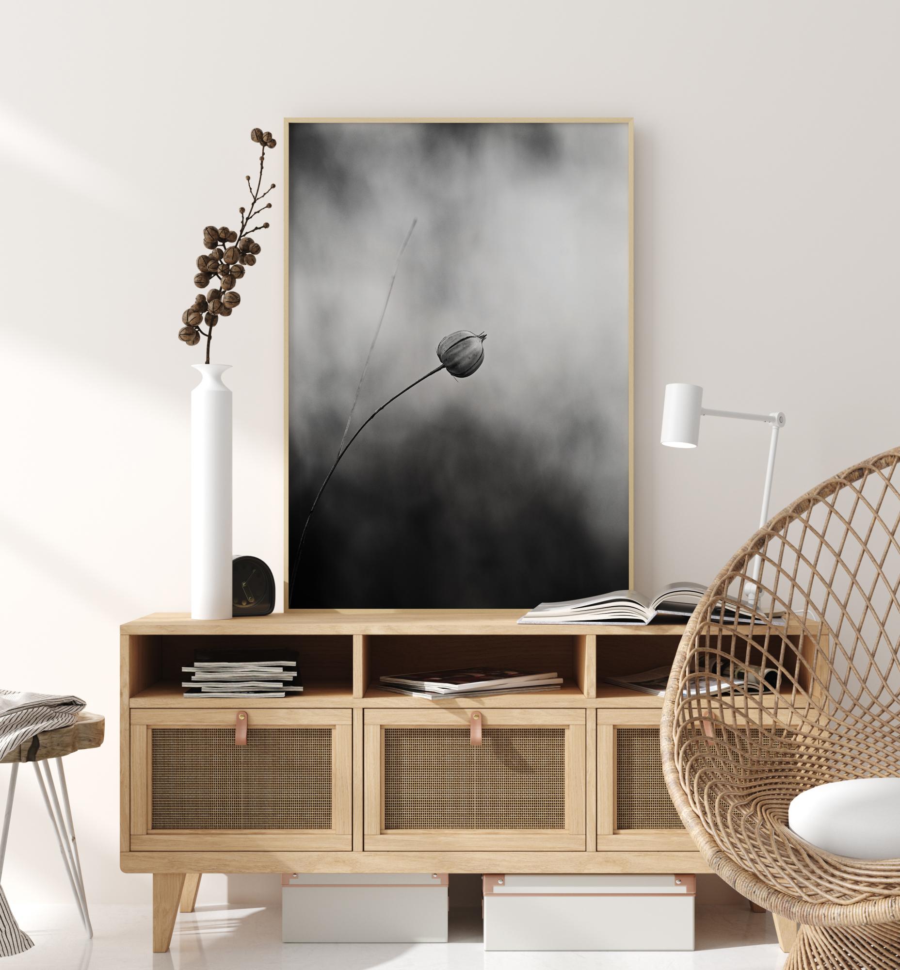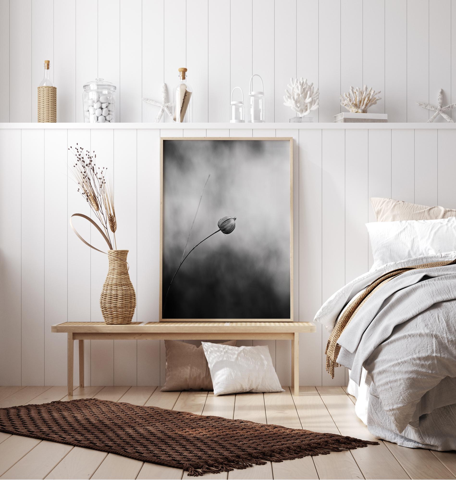 A black and white poster of a single flax plant after it has flowered. The flax bends into the centre of the image, highlighted by the white light. Below, the background is dark and out of focus to keep the attention on the single flower. Bring colour to this piece on a block colour wall.