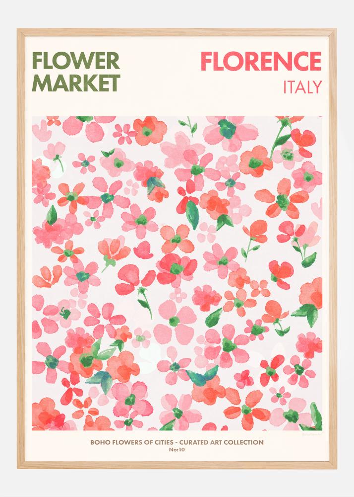 Encapsulate the essence of a thriving Italian city with this beautiful poster from our 'BOHO Flowers of Cities' - Curated Art Collection. This poster is a tribute to Florence, showcasing a field of watercolor-painted flowers in varying shades of pink and red, reminiscent of the vibrant flower markets in the heart of Italy. This delicately crafted artwork is perfect for infusing a sense of Florence's romance and beauty into any space.