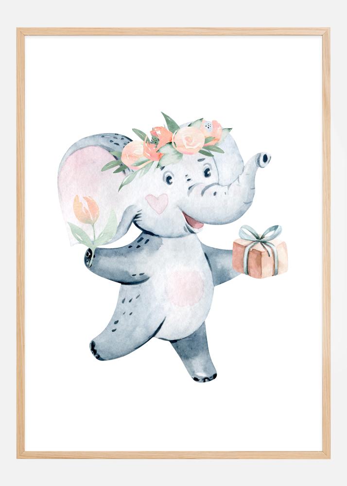 Lift the atmosphere in any room with this adorable elephant poster, which exudes joy and innocence. It features a charming little gray elephant lightly stepping, paired with a floral wreath in pink and peach tones on its head. The animal's demeanor is filled with kindness and happiness, and it holds a carefully wrapped gift, adding an extra touch of joy and generosity to the scene.