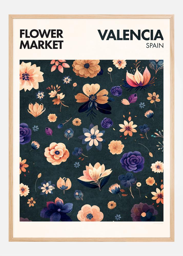 This colorful and vibrant poster depicts the floral splendor of Valencia's flower market in Spain. The detailed motif is a tribute to the market's diversity of flowers, where every type and color seems to have been captured in full bloom. From the delicate pastels to the bold, saturated colors, the design captures the feeling of a lush oasis in the heart of the city.