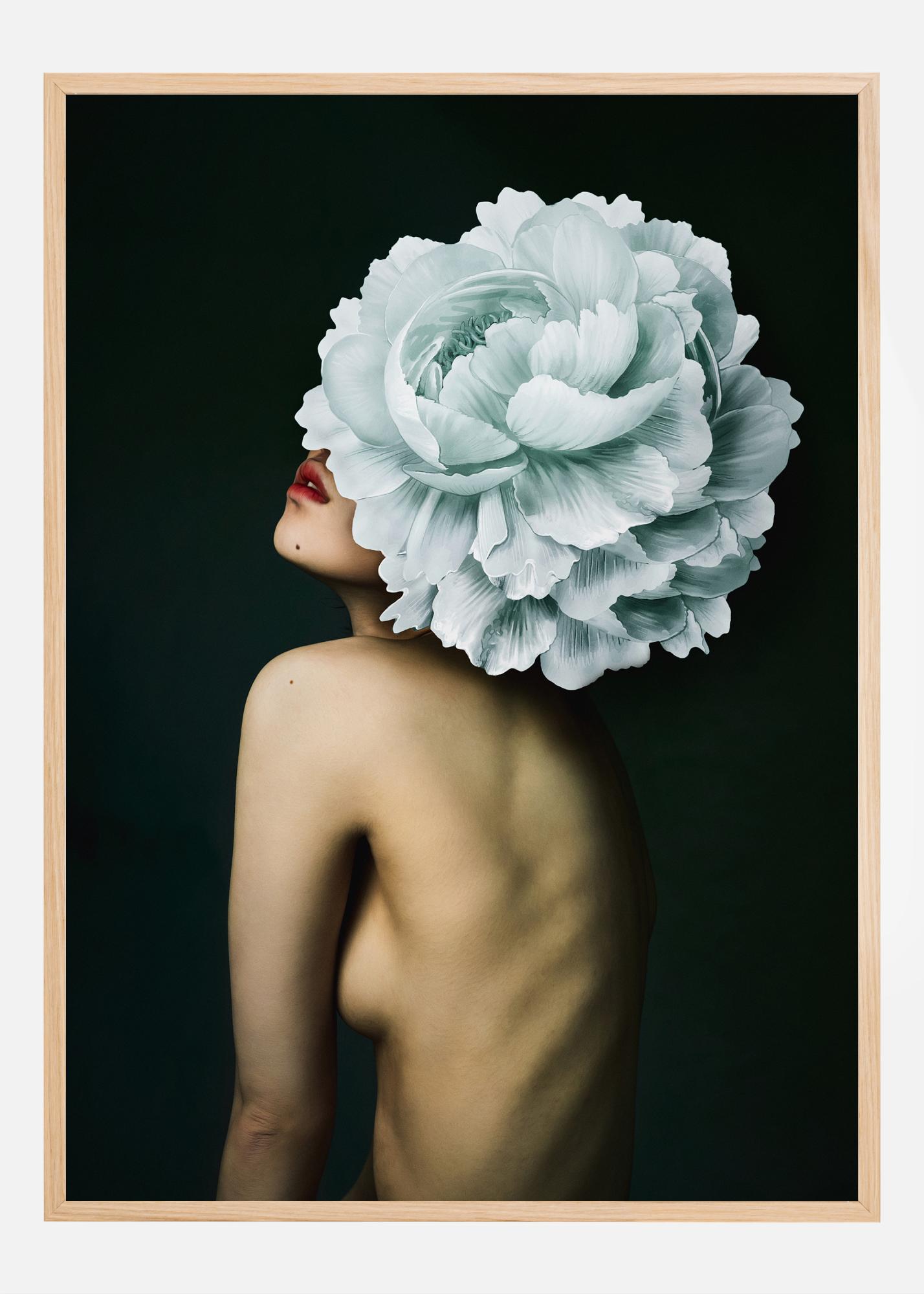 This poster portrays a fascinating and artistic composition where human beauty meets the wonders of nature. The image depicts a person seen from behind, the head replaced by a magnificent, almost oversized flower in white. The contrast between the soft skin and the detailed flower creates a visual symbiosis that is both dreamlike and suggestive. The print's color scheme is simple yet powerful, with shades of white, skin tone, and deep red of the lips, against a dark, almost monochromatic background.