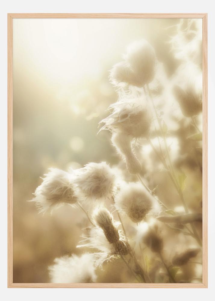 A magical poster of fluffy flowers in an early morning glow. The soft balls of the flowers are illuminated by the morning light creating angelic halos around each bloom. The soft pastel tones help to create a sleepy, magical feel for a gentle wake up.