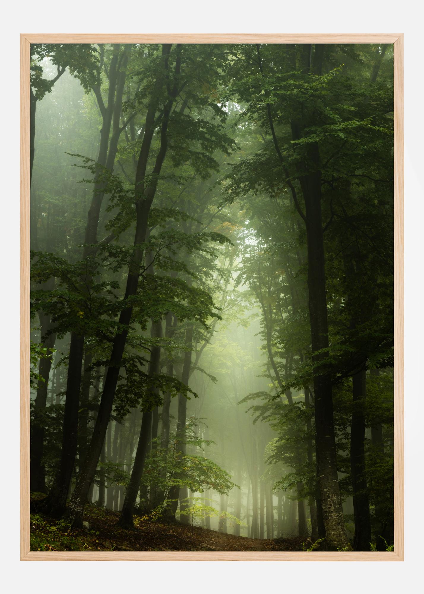 This atmospheric poster invites you to lose yourself in a forest wrapped in mist, where each tree seems to tell its own story. The soft haze that envelops the trees' robust trunks and the vibrant green foliage creates a dreamlike scene that appears to be drawn from another world. The gentle light filtering through the leaves adds a sense of mystique and stillness.