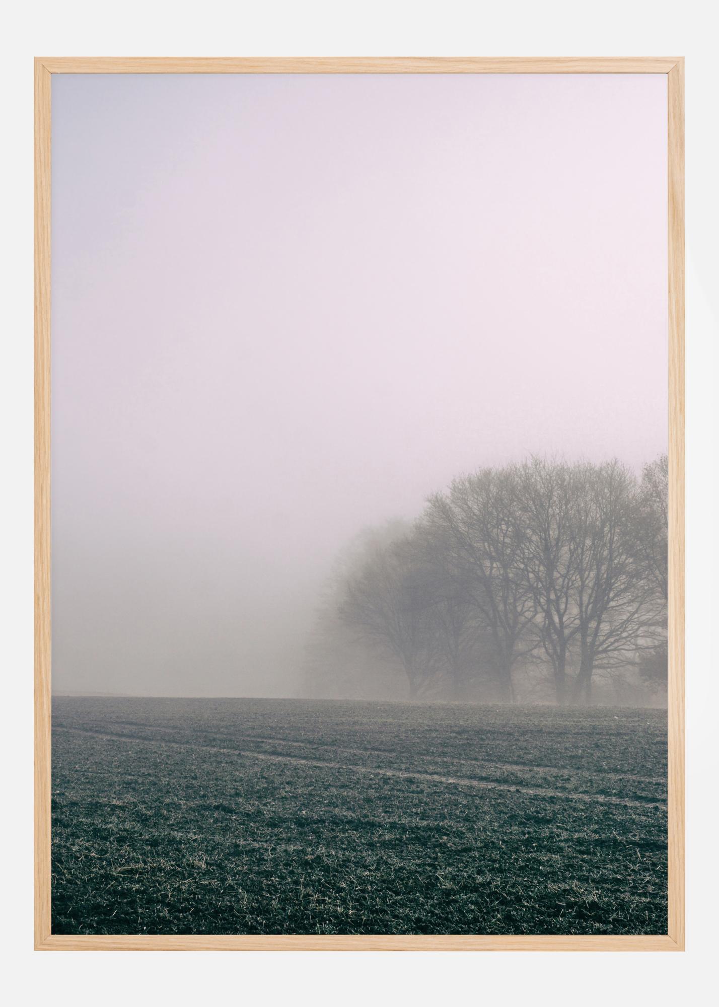 A bright poster of a field and trees in the early morning fog. The rising sun can be seen bringing brightness to the photo lighting up the green of the field and burning off the fog. Misty trees fill the background adding to this very British morning scene.