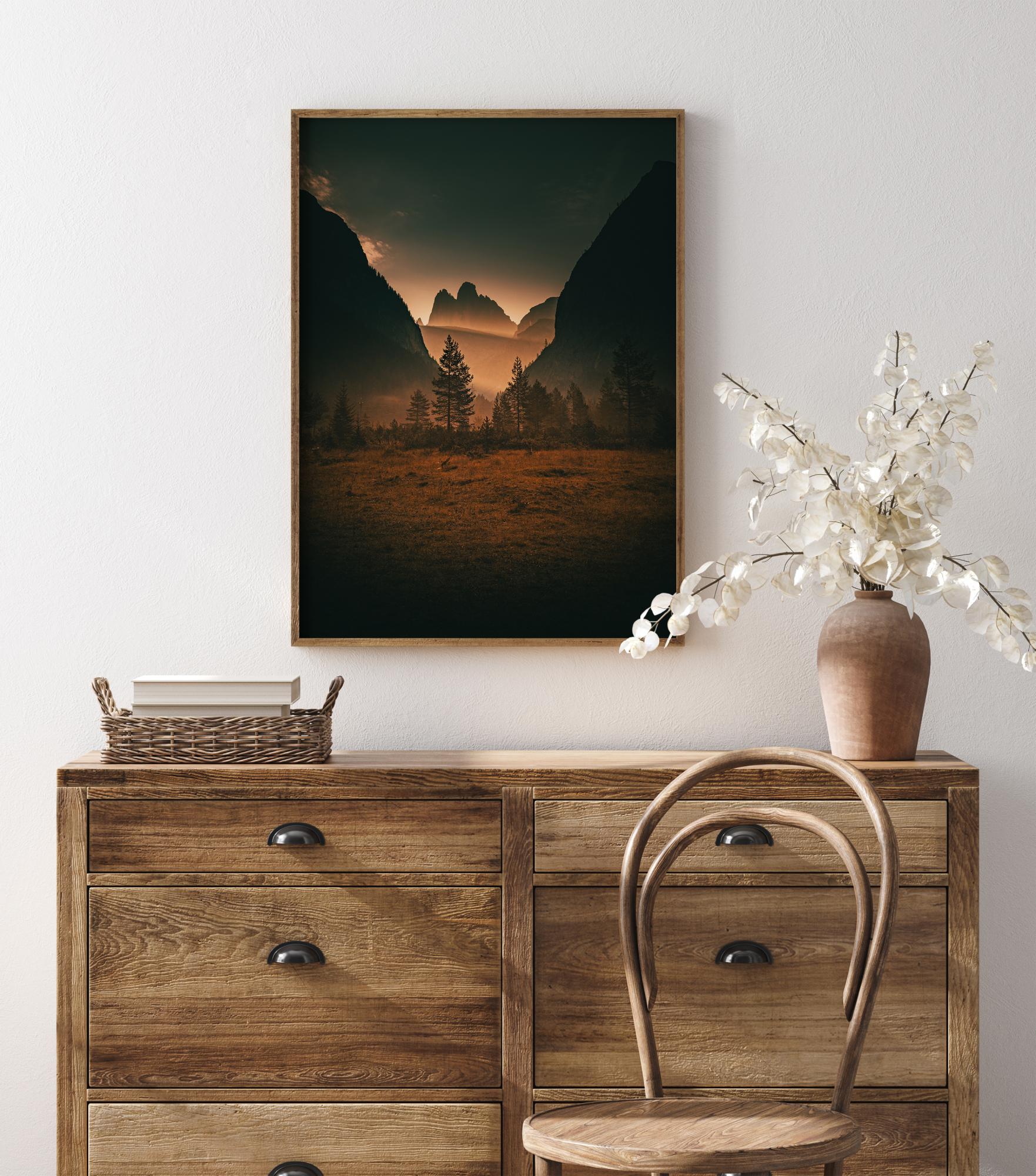 A fantastical poster of a dramatic forest as the sun sets. A deep orange field with pine trees in the background is flanked by two mountains to create a valley. In the centre, more mountains rise and the last of the sunset beams blast through to create a truly epic fantasy feel. Lose yourself in this magical land.