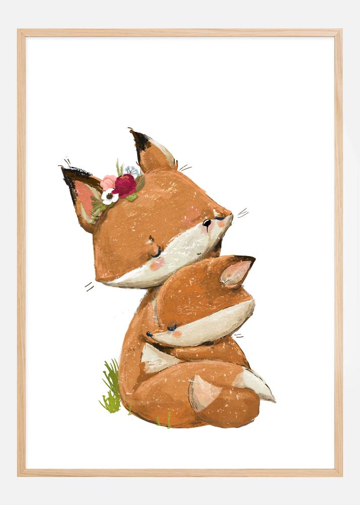 Redefine the feeling of tenderness with this beautiful poster depicting a mother fox hugging her young child in a tender embrace. The warm tones of the fox's fur together with the delicate flowers placed on the head create an image that is both heartfelt and aesthetically pleasing. This illustration captures the essence of maternal love and the special bond between parent and child.
