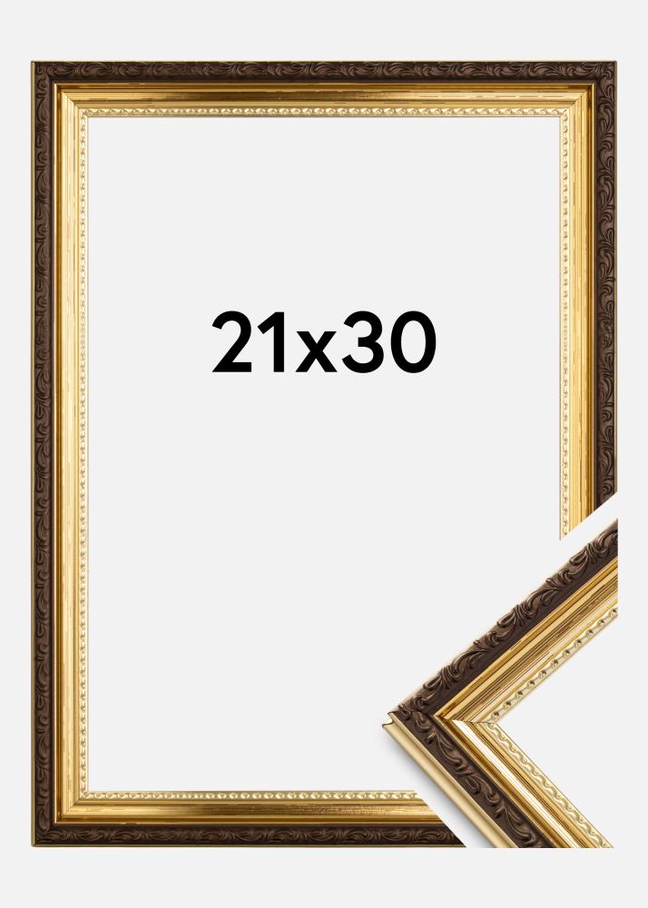 Looking for a beautifully decorated frame in a vintage style? Abisko Acrylic Glass Gold is a sturdy gold frame with unbelievably elegant detailing. The frame is 25mm wide and has a glossy gold colour with ornate brown edging. The vintage look is accentuated by an elegant wave pattern closest to the glass.