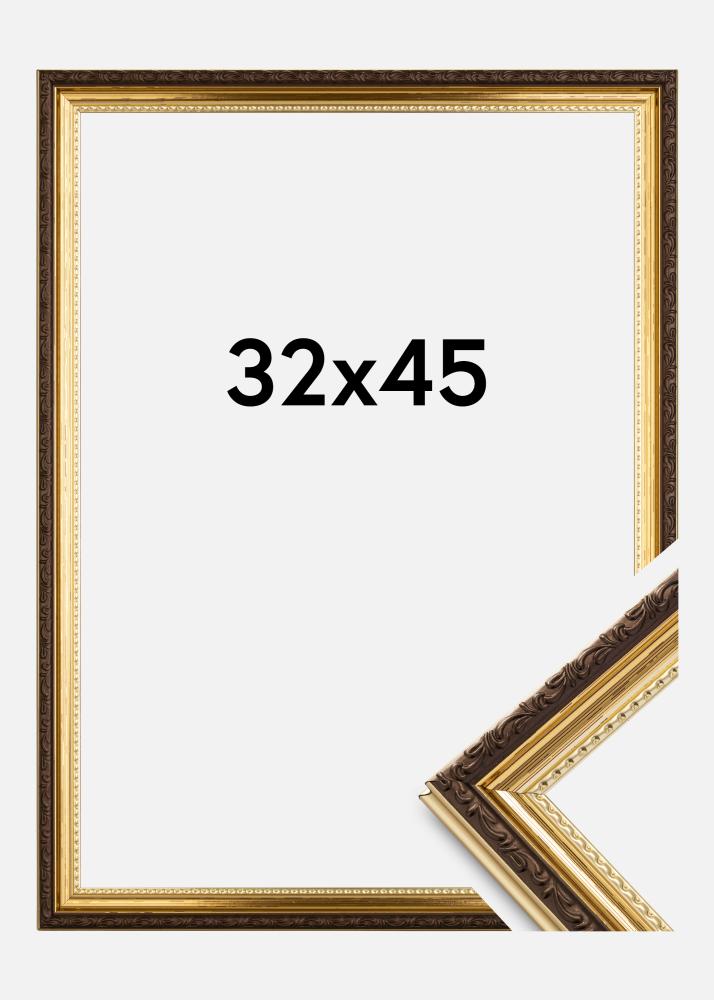 Looking for a beautifully decorated frame in a vintage style? Abisko Acrylic Glass Gold is a sturdy gold frame with unbelievably elegant detailing. The frame is 25mm wide and has a glossy gold colour with ornate brown edging. The vintage look is accentuated by an elegant wave pattern closest to the glass.