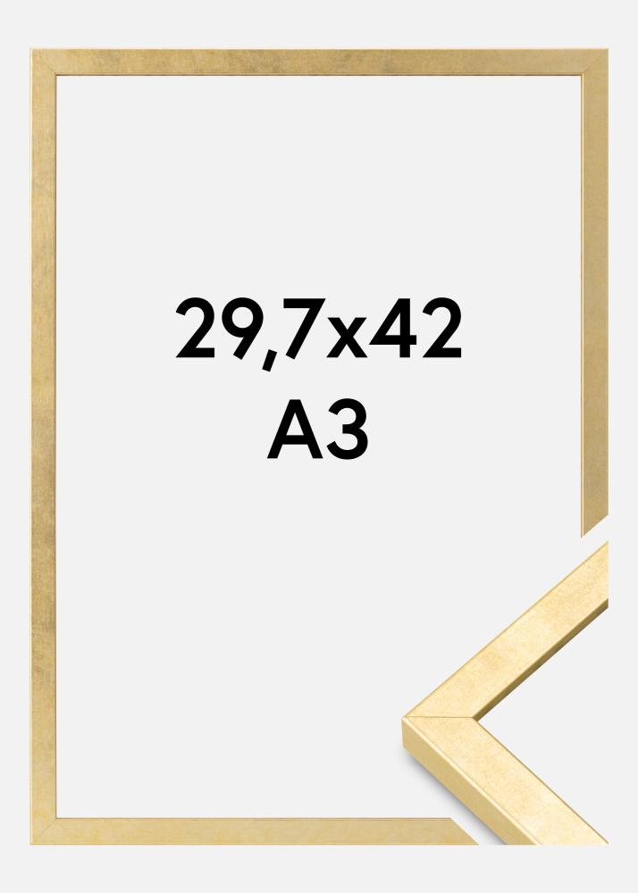 Create an elegant gallery wall with our exclusive gold frame in the size 29.7x42 cm (A3), perfect for showcasing your artwork or photographs. This gold-colored photo frame is a true eye-catcher that adds a luxurious touch to your home or office. Made of high-quality ayous wood, the frame offers a durable and stable construction designed to last.